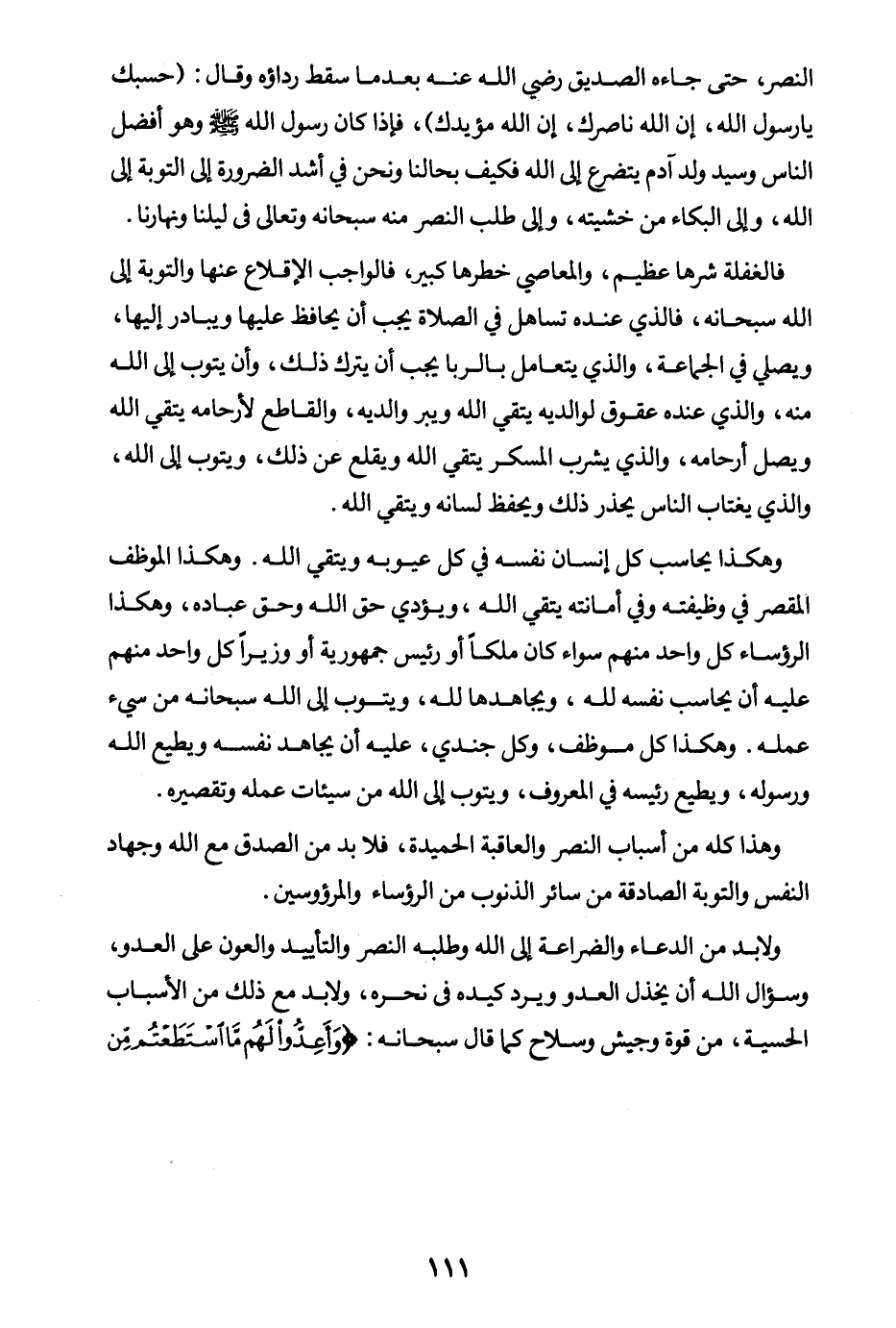 النصر، حتى جاءه الصديق رضي الله عنه بعدما سقط رداؤه وقال: (حسبك يا رسول الله إن الله ناصرك إن الله مؤيدك) ، فإذا كان رسول الله - صلى الله عليه وسلم - وهو أفضل الناس وسيد ولد آدم يتضرع إلى الله فكيف بحالنا ونحن في أشد الضرورة إلى التوبة إلى الله، وإلى البكاء من خشيته، وإلى طلب النصر منه سبحانه وتعالى في ليلنا ونهارنا. فالغفلة شرها عظيم، والمعاصي خطرها كبير، فالواجب الإقلاع عنها والتوبة إلى الله سبحانه، فالذي عنده تساهل في الصلاة يجب أن يحافظ عليها ويبادر إليها ويصلي في الجماعة، والذي يتعامل بالربا يجب أن يترك ذلك، وأن يتوب إلى الله منه، والذي عنده عقوق لوالديه يتقي الله ويبر والديه، والقاطع لأرحامه يتقي الله ويصل أرحامه، والذي يشرب المسكر يتقي الله ويقلع عن ذلك، ويتوب إلى الله، والذي يغتاب الناس يحذر ذلك ويحفظ لسانه ويتقي الله.