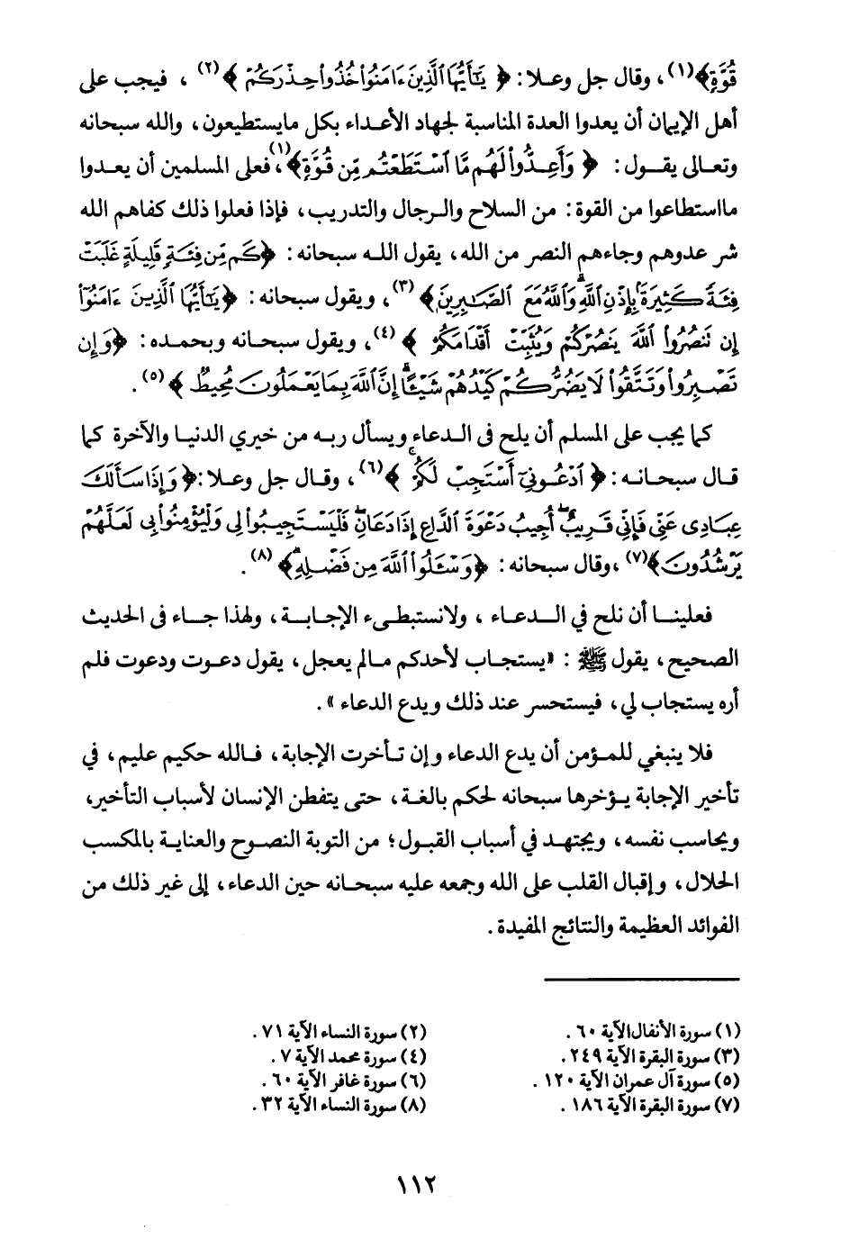 وقال جل وعلا: {يَا أَيُّهَا الَّذِينَ آمَنُوا خُذُوا حِذْرَكُمْ} (¬1) فيجب على أهل الإيمان أن يعدوا العدة المناسبة لجهاد الأعداء بكل ما يستطيعون، والله سبحانه وتعالى يقول: {وَأَعِدُّوا لَهُمْ مَا اسْتَطَعْتُمْ مِنْ قُوَّةٍ} (¬2) فعلى المسلمين أن يعدوا ما استطاعوا من القوة: من السلاح والرجال والتدريب، فإذا فعلوا ذلك كفاهم الله شر عدوهم وجاءهم النصر من الله، يقول الله سبحانه: {كَمْ مِنْ فِئَةٍ قَلِيلَةٍ غَلَبَتْ فِئَةً كَثِيرَةً بِإِذْنِ اللَّهِ وَاللَّهُ مَعَ الصَّابِرِينَ} (¬3) ويقول سبحانه: {يَا أَيُّهَا الَّذِينَ آمَنُوا إِنْ تَنْصُرُوا اللَّهَ يَنْصُرْكُمْ وَيُثَبِّتْ أَقْدَامَكُمْ} (¬4) ويقول سبحانه وبحمده: {وَإِنْ تَصْبِرُوا وَتَتَّقُوا لَا يَضُرُّكُمْ كَيْدُهُمْ شَيْئًا إِنَّ اللَّهَ بِمَا يَعْمَلُونَ مُحِيطٌ} (¬5) كما يجب على المسلم أن يلح في الدعاء، ويسأل ربه من خيري الدنيا والآخرة كما قال سبحانه: {ادْعُونِي أَسْتَجِبْ لَكُمْ} (¬6) وقال جل وعلا: {وَإِذَا سَأَلَكَ عِبَادِي عَنِّي فَإِنِّي قَرِيبٌ أُجِيبُ دَعْوَةَ الدَّاعِ إِذَا دَعَانِ فَلْيَسْتَجِيبُوا لِي وَلْيُؤْمِنُوا بِي لَعَلَّهُمْ يَرْشُدُونَ} (¬7) وقال سبحانه: {وَاسْأَلُوا اللَّهَ مِنْ فَضْلِهِ} (¬8) فعلينا أن نلح في الدعاء، ولا نستبطئ الإجابة، ولهذا جاء في الحديث الصحيح، يقول - صلى الله عليه وسلم - «يستجاب لأحدكم ما لم يعجل يقول دعوت ودعوت فلم أره يستجاب لي فيستحسر عند ذلك ويدع الدعاء (¬9) » . فلا ينبغي للمؤمن أن يدع الدعاء وإن تأخرت الإجابة، فالله حكيم عليم، في تأخير الإجابة يؤخرها سبحانه لحكم بالغة، حتى يتفطن الإنسان لأسباب التأخير، ويحاسب نفسه، ويجتهد في أسباب القبول. من التوبة النصوح والعناية بالمكسب الحلال، وإقبال القلب على الله وجمعه عليه سبحانه حين الدعاء، إلى غير ذلك من الفوائد العظيمة والنتائج المفيدة.