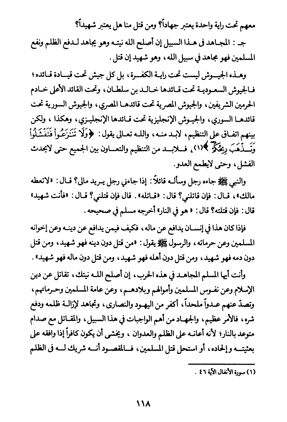 جـ: المجاهد في هذا السبيل إن أصلح الله نيته وهو يجاهد لدفع الظلم ونفع المسلمين فهو مجاهد في سبيل الله، وهو شهيد إن قتل. وهذه الجيوش ليست تحت راية الكفرة، بل كل جيش تحت قيادة قائده. فالجيوش السعودية تحت قائدها خالد بن سلطان، وتحت القائد الأعلى خادم الحرمين الشريفين، والجيوش المصرية تحت قائدها المصري، والجيوش السورية تحت قائدها السوري، والجيوش الإنجليزية تحت قائدها الإنجليزي، وهكذا، ولكن بينهم اتفاق على التنظيم، لا بد منه، والله تعالى يقول: {وَلَا تَنَازَعُوا فَتَفْشَلُوا وَتَذْهَبَ رِيحُكُمْ} (¬1) فلا بد من التنظيم والتعاون بين الجميع حتى لا يحدث الفشل، وحتى لا يطمع العدو.