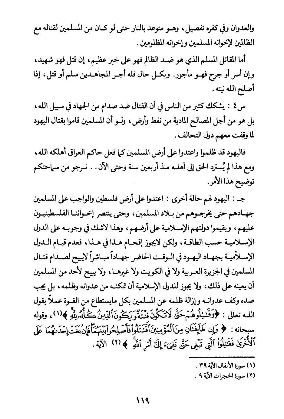 جـ: اليهود لهم حالة أخرى: اعتدوا على أرض فلسطين، والواجب على المسلمين جهادهم حتى يخرجوهم من بلاد المسلمين، وحتى ينتصر إخواننا الفلسطينيون عليهم، ويقيموا دولتهم الإسلامية على أرضهم، وهذا لا شك في وجوبه على الدول الإسلامية حسب الطاقة، ولكن لا يجوز إقحام هذا في هذا، فعدم قيام الدول الإسلامية بجهاد اليهود في الوقت الحاضر جهادا مباشرا لا يبيح لصدام قتال المسلمين في الجزيرة العربية ولا في الكويت ولا غيرها، ولا يبيح لأحد من المسلمين أن يعينه على ذلك، ولا يجوز للدول الإسلامية أن تمكنه من عدوانه وظلمه، بل يجب صده وكف عدوانه وإزالة ظلمه عن المسلمين بكل ما يستطاع من القوة عملا بقول الله تعالى: {وَقَاتِلُوهُمْ حَتَّى لَا تَكُونَ فِتْنَةٌ وَيَكُونَ الدِّينُ كُلُّهُ لِلَّهِ} (¬1) وقوله سبحانه: {وَإِنْ طَائِفَتَانِ مِنَ الْمُؤْمِنِينَ اقْتَتَلُوا فَأَصْلِحُوا بَيْنَهُمَا فَإِنْ بَغَتْ إِحْدَاهُمَا عَلَى الْأُخْرَى فَقَاتِلُوا الَّتِي تَبْغِي حَتَّى تَفِيءَ إِلَى أَمْرِ اللَّهِ} (¬2) الآية.