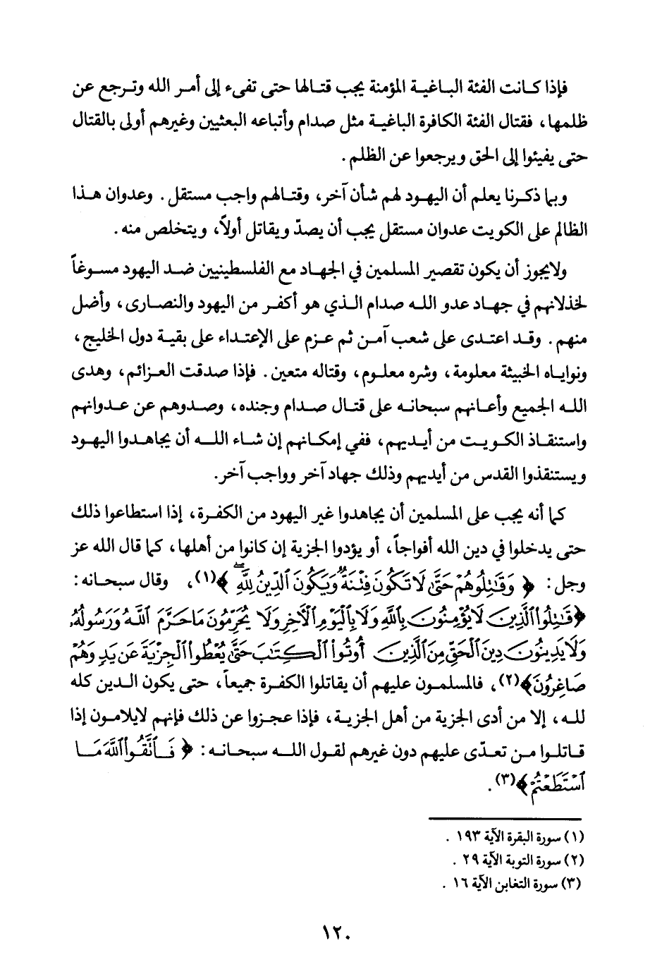 ولا يجوز أن يكون تقصير المسلمين في الجهاد مع الفلسطينيين ضد اليهود مسوغا لخذلانهم في جهاد عدو الله صدام الذي هو أكفر من اليهود والنصارى، وأضل منهم. وقد اعتدى على شعب آمن ثم عزم على الاعتداء على بقية دول الخليج، ونواياه الخبيثة معلومة، وشر معلوم، وقتاله متعين. فإذا صدقت العزائم، وهدى الله الجميع وأعانهم سبحانه على قتال صدام وجنده، وصدوهم عن عدوانهم واستنقذوا الكويت من أيديهم، ففي إمكانهم إن شاء الله أن يجاهدوا اليهود ويستنقذوا القدس من أيديهم، وذلك جهاد آخر وواجب آخر، كما أنه يجب على المسلمين أن يجاهدوا غير اليهود من الكفرة، إذا استطاعوا ذلك حتى يدخلوا في دين الله أفواجا، أو يؤدوا الجزية إن كانوا من أهلها، كما قال الله عز وجل: {وَقَاتِلُوهُمْ حَتَّى لَا تَكُونَ فِتْنَةٌ وَيَكُونَ الدِّينُ لِلَّهِ} (¬1) وقال سبحانه: {قَاتِلُوا الَّذِينَ لَا يُؤْمِنُونَ بِاللَّهِ وَلَا بِالْيَوْمِ الْآخِرِ وَلَا يُحَرِّمُونَ مَا حَرَّمَ اللَّهُ وَرَسُولُهُ وَلَا يَدِينُونَ دِينَ الْحَقِّ مِنَ الَّذِينَ أُوتُوا الْكِتَابَ حَتَّى يُعْطُوا الْجِزْيَةَ عَنْ يَدٍ وَهُمْ صَاغِرُونَ} (¬2) فالمسلمون عليهم أن يقاتلوا الكفرة جميعا، حتى يكون الدين كله لله، إلا من أدى الجزية من أهل الجزية، فإذا عجزوا عن ذلك فإنهم لا يلامون إذا قاتلوا من تعدى عليهم دون غيرهم؛ لقول الله سبحانه: {فَاتَّقُوا اللَّهَ مَا اسْتَطَعْتُمْ} (¬3)