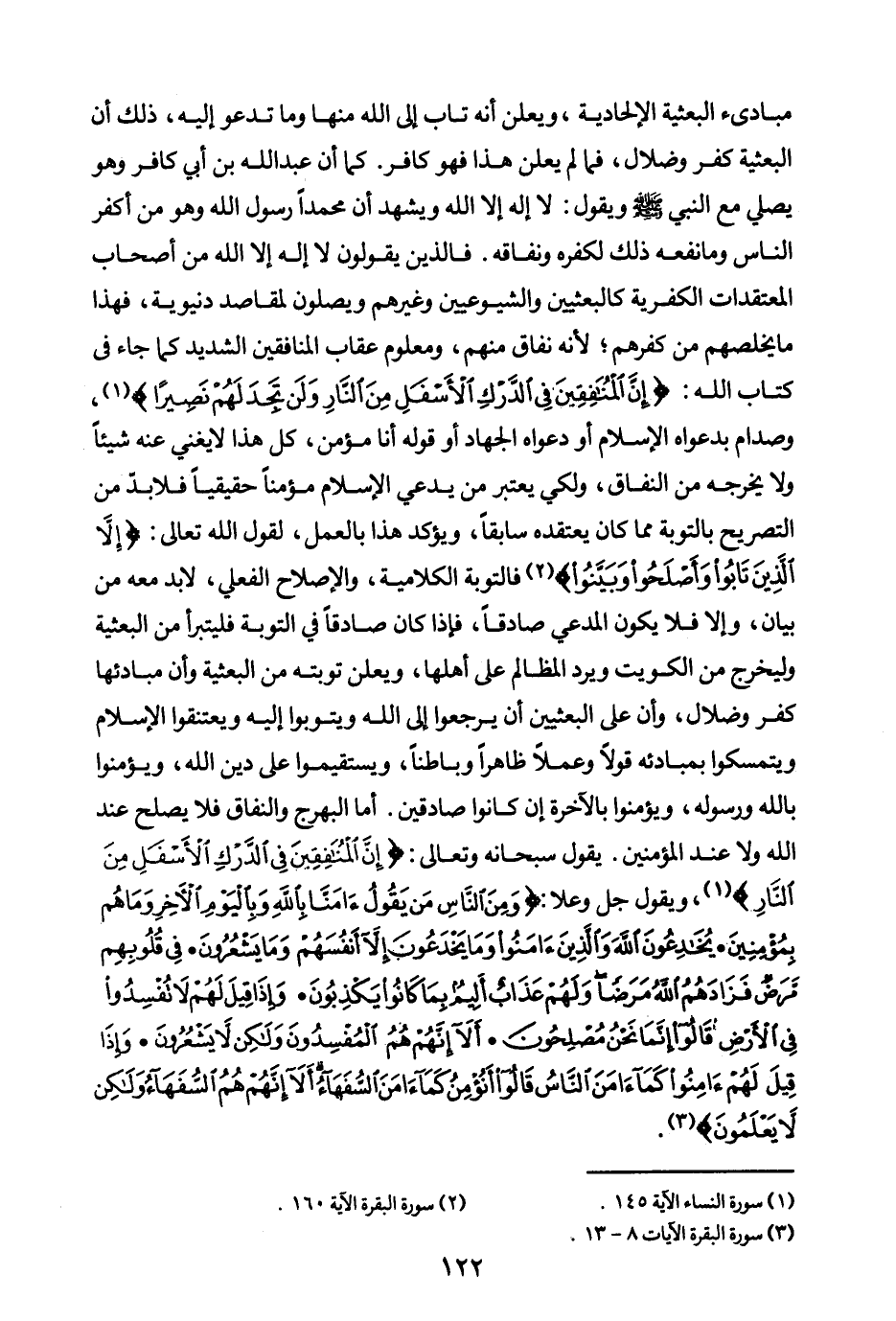 مبادئ البعثية الإلحادية، ويعلن أنه تاب إلى الله منها وما تدعو إليه، ذلك أن البعثية كفر وضلال، فما لم يعلن هذا فهو كافر. كما أن عبد الله بن أبي كافر وهو يصلي مع النبي - صلى الله عليه وسلم- ويقول: لا إله إلا الله ويشهد أن محمدا رسول الله، وهو من أكفر الناس، وما نفعه ذلك لكفره ونفاقه، فالذين يقولون لا إله إلا الله من أصحاب المعتقدات الكفرية كالبعثيين والشيوعيين وغيرهم ويصلون لمقاصد دنيوية، فهذا ما يخلصهم من كفرهم. لأنه نفاق منهم، ومعلوم عقاب المنافقين الشديد كما جاء في كتاب الله: {إِنَّ الْمُنَافِقِينَ فِي الدَّرْكِ الْأَسْفَلِ مِنَ النَّارِ وَلَنْ تَجِدَ لَهُمْ نَصِيرًا} (¬1) وصدام بدعواه الإسلام ودعواه الجهاد أو قوله أنا مؤمن، كل هذا لا يغني عنه شيئا ولا يخرجه من النفاق، ولكي يعتبر من يدعي الإسلام مؤمنا حقيقيا فلا بد من التصريح بالتوبة مما كان يعتقده سابقا، ويؤكد هذا بالعمل، لقول الله تعالى: {إِلَّا الَّذِينَ تَابُوا وَأَصْلَحُوا وَبَيَّنُوا} (¬2) فالتوبة الكلامية، والإصلاح الفعلي، لا بد معه من بيان، وإلا فلا يكون المدعي صادقا، فإذا كان صادقا في التوبة فليتبرأ من البعثية وليخرج من الكويت ويرد المظالم على أهلها، ويعلن توبته من البعثية وأن مبادئها كفر وضلال، وأن على البعثيين أن يرجعوا إلى الله ويتوبوا إليه، ويعتنقوا الإسلام، ويتمسكوا بمبادئه قولا وعملا ظاهرا وباطنا، ويستقيموا على دين الله، ويؤمنوا بالله ورسوله، ويؤمنوا بالآخرة إن كانوا صادقين.
