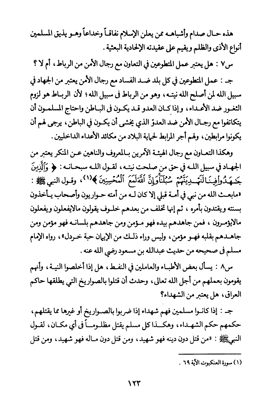 ج: عمل المتطوعين في كل بلد ضد الفساد مع رجال الأمن يعتبر من الجهاد في سبيل الله لمن أصلح الله نيته، وهو من الرباط في سبيل الله؛ لأن الرباط هو لزوم الثغور ضد الأعداء، وإذا كان العدو قد يكون في الباطن واحتاج المسلمون أن يتكاتفوا مع رجال الأمن ضد العدو الذي يخشى أن يكون في الباطن، يرجى لهم أن يكونوا مرابطين، ولهم أجر المرابط لحماية البلاد من مكائد الأعداء الداخليين، وهكذا التعاون مع رجال الهيئة الآمرين بالمعروف والناهين عن المنكر يعتبر من الجهاد في سبيل الله في حق من صلحت نيته؛ لقول الله سبحانه: {وَالَّذِينَ جَاهَدُوا فِينَا لَنَهْدِيَنَّهُمْ سُبُلَنَا وَإِنَّ اللَّهَ لَمَعَ الْمُحْسِنِينَ} (¬1)