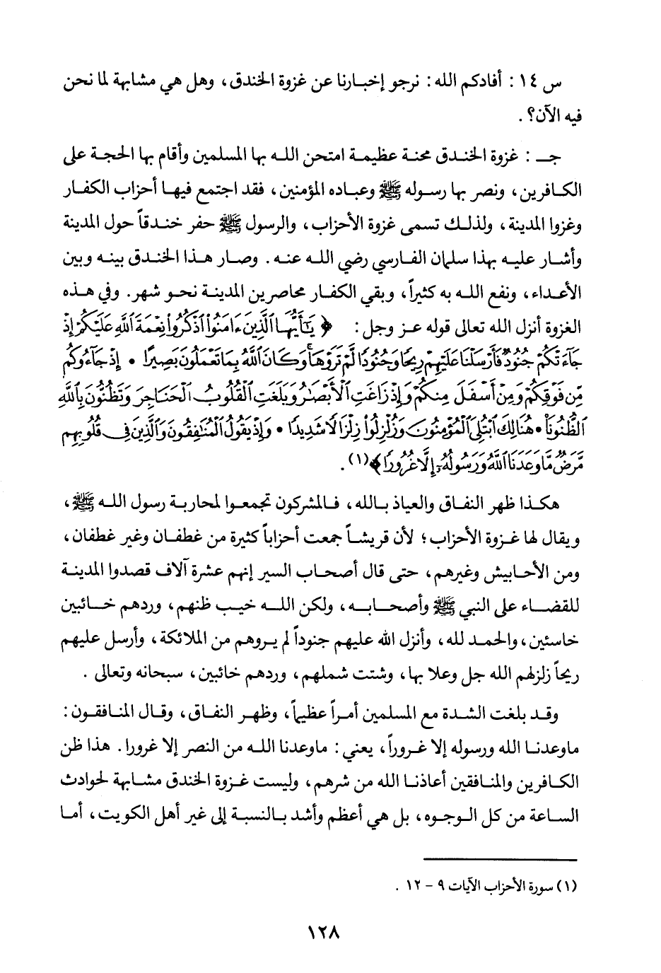س 14: أفادكم الله: نرجو إخبارنا عن غزوة الخندق، وهل هي مشابهة لما نحن فيه الآن؟
