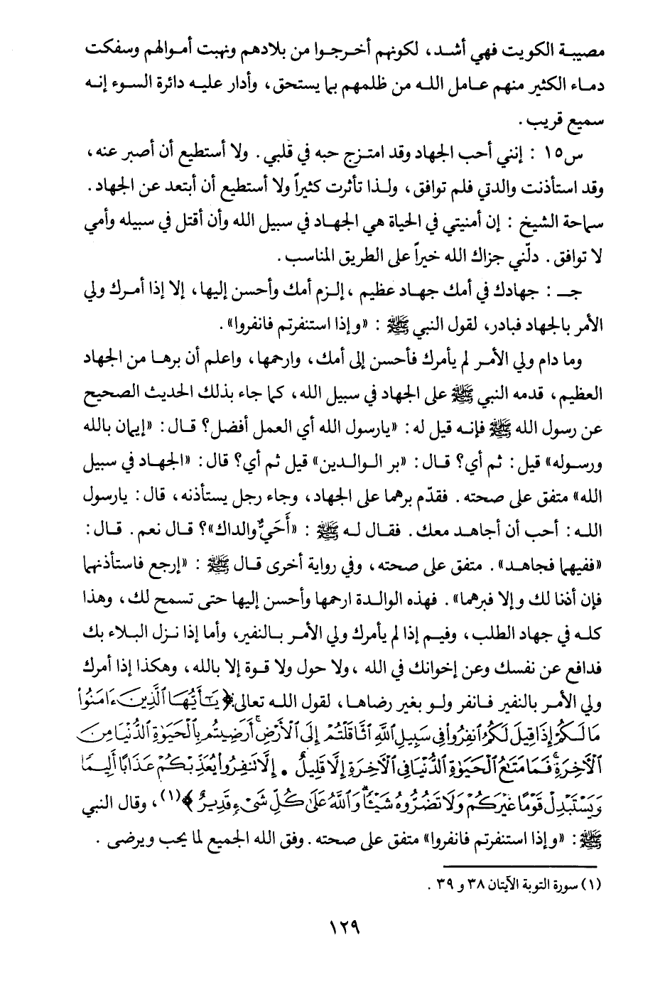 وفي رواية أخرى قال - صلى الله عليه وسلم - «ارجع فاستأذنهما فإن أذنا لك وإلا فبرهما (¬4) » فهذه الوالدة ارحمها وأحسن إليها حتى تسمح لك، وهذا كله في جهاد الطلب، وفيم إذا لم يأمرك ولي الأمر بالنفير، وأما إذا نزل البلاء بك فدافع عن نفسك وعن إخوانك في الله، ولا حول ولا قوة إلا بالله، وهكذا إذا أمرك ولي الأمر بالنفير فانفر ولو بغير رضاها؛ لقول الله تعالى {يَا أَيُّهَا الَّذِينَ آمَنُوا مَا لَكُمْ إِذَا قِيلَ لَكُمُ انْفِرُوا فِي سَبِيلِ اللَّهِ اثَّاقَلْتُمْ إِلَى الْأَرْضِ أَرَضِيتُمْ بِالْحَيَاةِ الدُّنْيَا مِنَ الْآخِرَةِ فَمَا مَتَاعُ الْحَيَاةِ الدُّنْيَا فِي الْآخِرَةِ إِلَّا قَلِيلٌ} (¬5) {إِلَّا تَنْفِرُوا يُعَذِّبْكُمْ عَذَابًا أَلِيمًا وَيَسْتَبْدِلْ قَوْمًا غَيْرَكُمْ وَلَا تَضُرُّوهُ شَيْئًا وَاللَّهُ عَلَى كُلِّ شَيْءٍ قَدِيرٌ} (¬6)