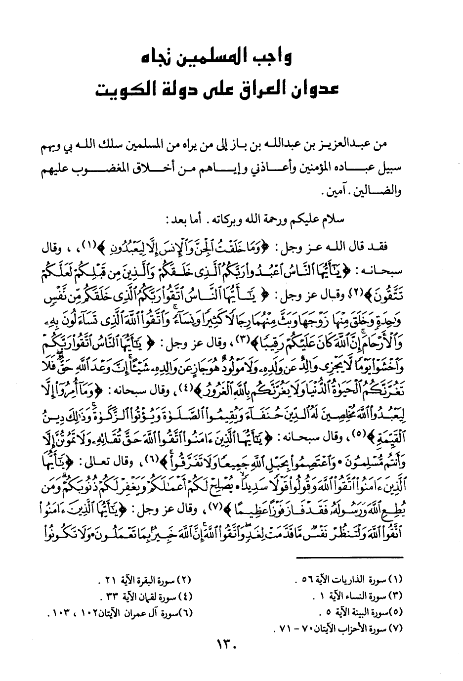 من عبد العزيز بن عبد الله بن باز إلى من يراه من المسلمين، سلك الله بي وبهم سبيل عباده المؤمنين، وأعاذني وإياهم من أخلاق المغضوب عليهم والضالين. آمين.