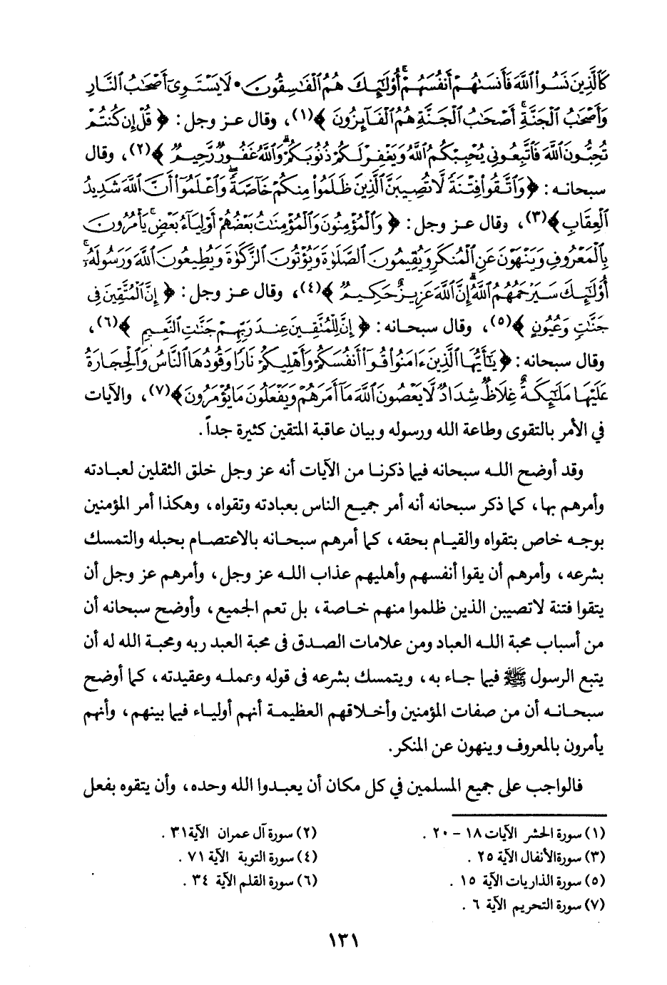 وقال سبحانه: {إِنَّ لِلْمُتَّقِينَ عِنْدَ رَبِّهِمْ جَنَّاتِ النَّعِيمِ} (¬5) وقال سبحانه: {يَا أَيُّهَا الَّذِينَ آمَنُوا قُوا أَنْفُسَكُمْ وَأَهْلِيكُمْ نَارًا وَقُودُهَا النَّاسُ وَالْحِجَارَةُ عَلَيْهَا مَلَائِكَةٌ غِلَاظٌ شِدَادٌ لَا يَعْصُونَ اللَّهَ مَا أَمَرَهُمْ وَيَفْعَلُونَ مَا يُؤْمَرُونَ} (¬6) والآيات في الأمر بالتقوى وطاعة الله ورسوله وبيان عاقب المتقين كثيرة جدا.