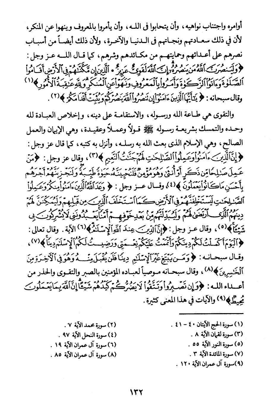 ولأن ذلك أيضا من أسباب نصرهم على أعدائهم وحمايتهم من مكائدهم وشرهم، كما قال الله عز وجل: {وَلَيَنْصُرَنَّ اللَّهُ مَنْ يَنْصُرُهُ إِنَّ اللَّهَ لَقَوِيٌّ عَزِيزٌ} (¬1) {الَّذِينَ إِنْ مَكَّنَّاهُمْ فِي الْأَرْضِ أَقَامُوا الصَّلَاةَ وَآتَوُا الزَّكَاةَ وَأَمَرُوا بِالْمَعْرُوفِ وَنَهَوْا عَنِ الْمُنْكَرِ وَلِلَّهِ عَاقِبَةُ الْأُمُورِ} (¬2) وقال سبحانه: {يَا أَيُّهَا الَّذِينَ آمَنُوا إِنْ تَنْصُرُوا اللَّهَ يَنْصُرْكُمْ وَيُثَبِّتْ أَقْدَامَكُمْ} (¬3) والتقوى هي طاعة الله ورسوله، والاستقامة على دينه، وإخلاص العبادة لله وحده والتمسك بشريعة رسوله- صلى الله عليه وسلم - قولا وعملا وعقيدة، وهي الإيمان والعمل الصالح، وهي الإسلام الذي بعث الله به رسله، وأنزل به كتبه، كما قال عز وجل: {إِنَّ الَّذِينَ آمَنُوا وَعَمِلُوا الصَّالِحَاتِ لَهُمْ جَنَّاتُ النَّعِيمِ} (¬4)