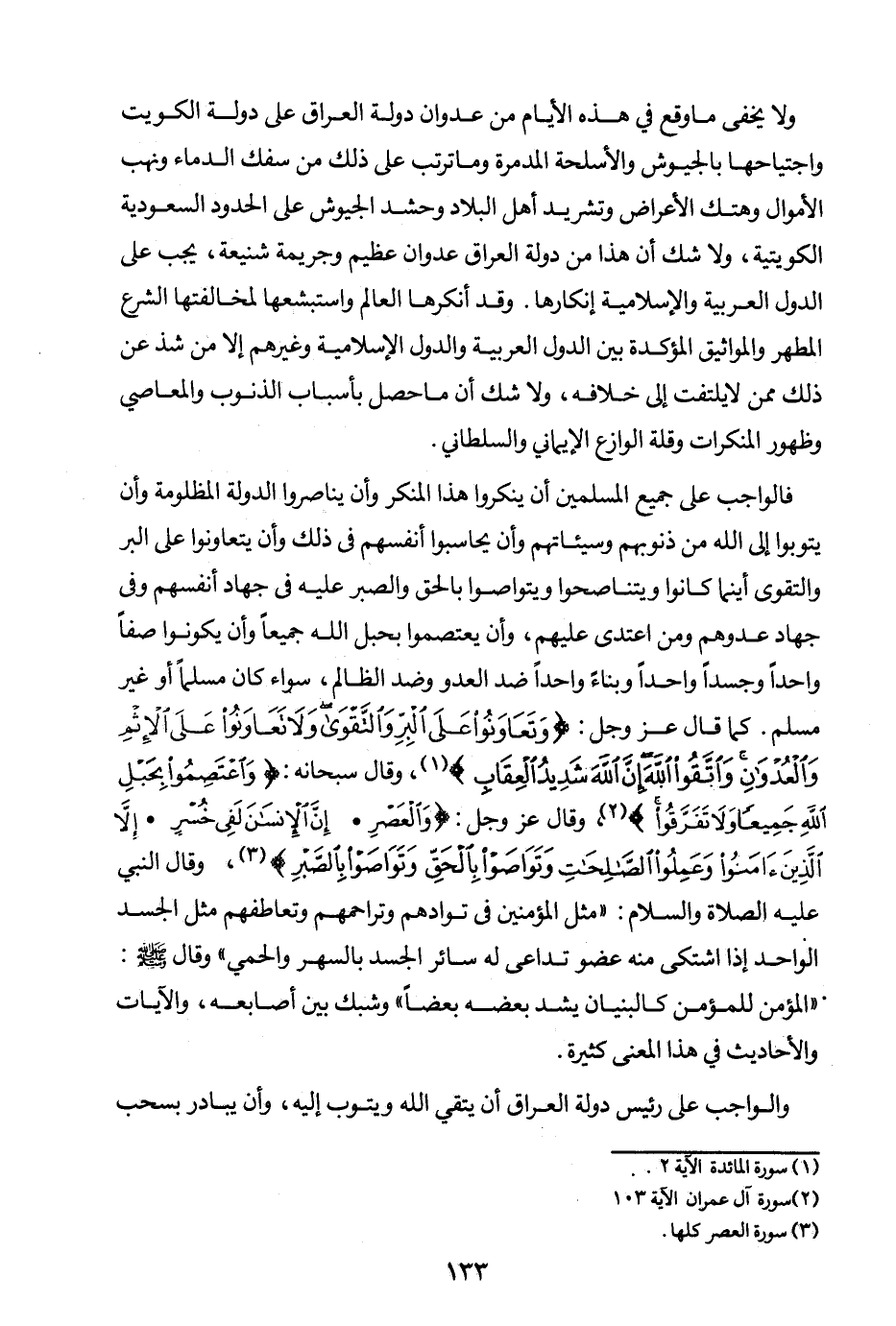 ولا يخفى ما وقع في هذه الأيام من عدوان دولة العراق على دولة الكويت واجتياحها بالجيوش والأسلحة المدمرة، وما ترتب على ذلك من سفك الدماء ونهب الأموال وهتك الأعراض وتشريد أهل البلاد وحشد الجيوش على الحدود السعودية الكويتية، ولا شك أن هذا من دولة العراق عدوان عظيم وجريمة شنيعة، يجب على الدول العربية والإسلامية إنكارها، وقد أنكرها العالم واستبشعها لمخالفتها للشرع المطهر والمواثيق المؤكدة بين الدول العربية والدول الإسلامية وغيرهم إلا من شذ عن ذلك ممن لا يلتفت إلى خلافه، ولا شك أن ما حصل بأسباب الذنوب والمعاصي وظهور المنكرات وقلة الوازع الإيماني والسلطاني.