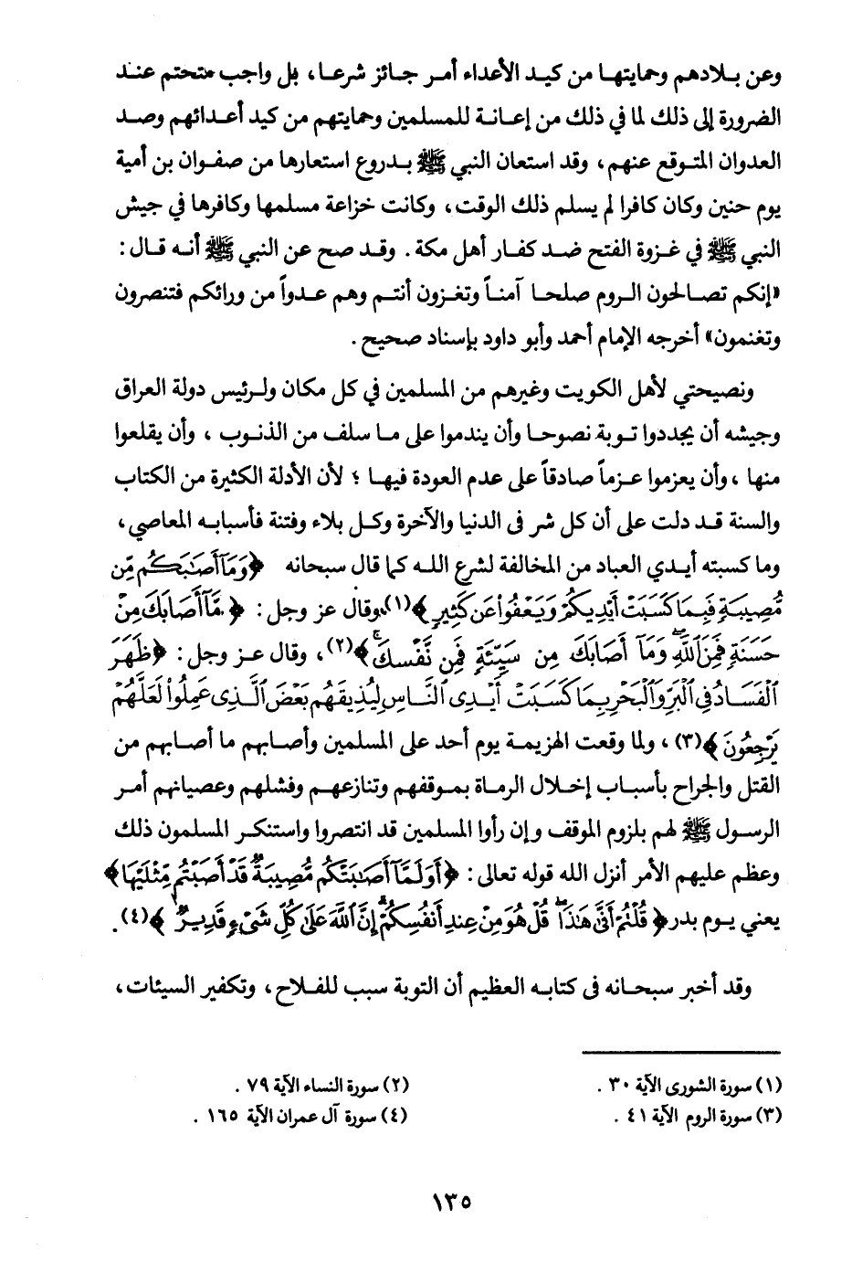 ونصيحتي لأهل الكويت وغيرهم من المسلمين في كل مكان ولرئيس دولة العراق وجيشه أن يجددوا توبة نصوحا وأن يندموا على ما سلف من الذنوب، وأن يقلعوا منها، وأن يعزموا عزما صادقا على عدم العودة فيها؛ لأن الأدلة الكثيرة من الكتاب والسنة قد دلت على أن كل شر في الدنيا والآخرة وكل بلاء وفتنة فأسبابه المعاصي، وما كسبته أيدي العباد من المخالفة لشرع الله كما قال سبحانه: {وَمَا أَصَابَكُمْ مِنْ مُصِيبَةٍ فَبِمَا كَسَبَتْ أَيْدِيكُمْ وَيَعْفُو عَنْ كَثِيرٍ} (¬2) وقال عز وجل: {مَا أَصَابَكَ مِنْ حَسَنَةٍ فَمِنَ اللَّهِ وَمَا أَصَابَكَ مِنْ سَيِّئَةٍ فَمِنْ نَفْسِكَ} (¬3) وقال عز وجل: {ظَهَرَ الْفَسَادُ فِي الْبَرِّ وَالْبَحْرِ بِمَا كَسَبَتْ أَيْدِي النَّاسِ لِيُذِيقَهُمْ بَعْضَ الَّذِي عَمِلُوا لَعَلَّهُمْ يَرْجِعُونَ} (¬4)