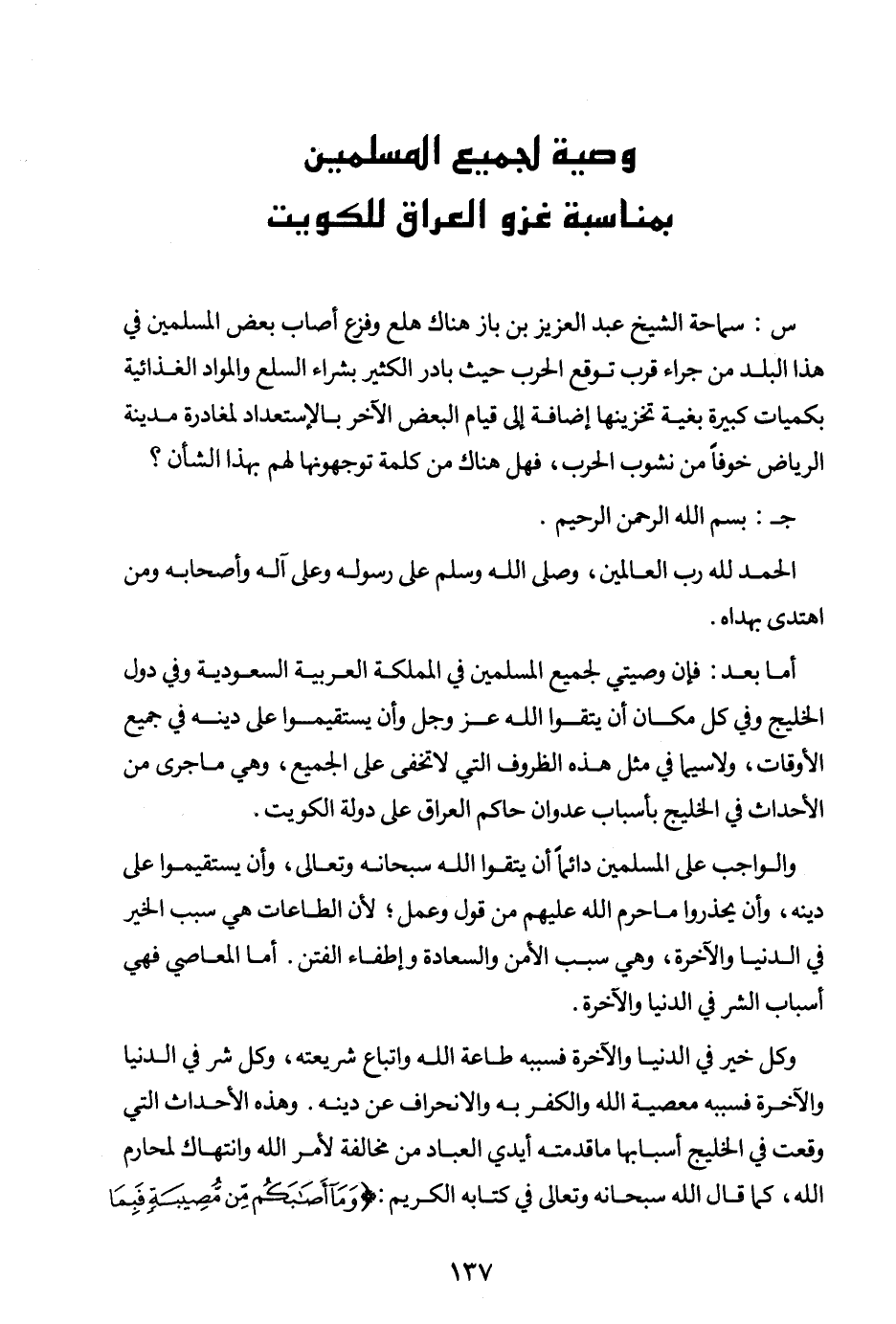 أما بعد: فإن وصيتي لجميع المسلمين في المملكة العربية السعودية، وفي دول الخليج، وفي كل مكان، أن يتقوا الله عز وجل وأن يستقيموا على دينه في جميع الأوقات، ولا سيما في مثل هذه الظروف التي لا تخفى على الجميع، وهي ما جرى من الأحداث في الخليج بأسباب عدوان حاكم العراق على دولة الكويت. والواجب على المسلمين دائما أن يتقوا الله سبحانه وتعالى، وأن يستقيموا على دينه، وأن يحذروا ما حرم الله عليهم من قول وعمل؛ لأن الطاعات هي سبب الخير في الدنيا والاخرة، وهي سبب الأمن والسعادة وإطفاء الفتن.