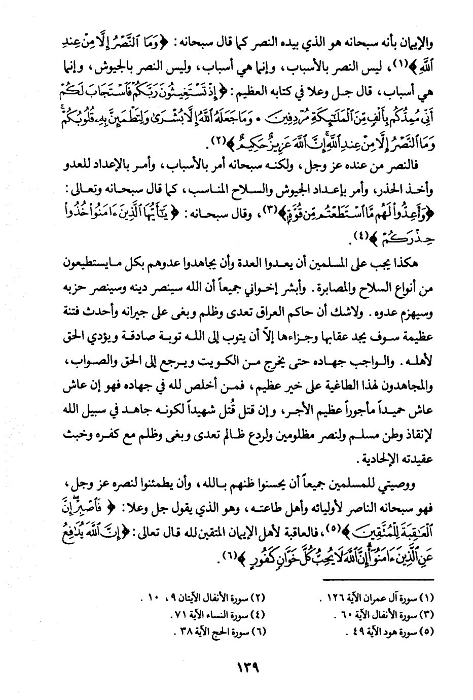والإيمان بأنه سبحانه هو الذي بيده النصر كما قال سبحانه: {وَمَا النَّصْرُ إِلَّا مِنْ عِنْدِ اللَّهِ الْعَزِيزِ} (¬1) ليس النصر بالأسباب، وإنما هي أسباب، وليس النصر بالجيوش وإنما هي أسباب، قال جل وعلا في كتابه العظيم: {إِذْ تَسْتَغِيثُونَ رَبَّكُمْ فَاسْتَجَابَ لَكُمْ أَنِّي مُمِدُّكُمْ بِأَلْفٍ مِنَ الْمَلَائِكَةِ مُرْدِفِينَ} (¬2) {وَمَا جَعَلَهُ اللَّهُ إِلَّا بُشْرَى وَلِتَطْمَئِنَّ بِهِ قُلُوبُكُمْ وَمَا النَّصْرُ إِلَّا مِنْ عِنْدِ اللَّهِ إِنَّ اللَّهَ عَزِيزٌ حَكِيمٌ} (¬3) فالنصر من عنده عز وجل، ولكنه سبحانه أمر بالأسباب، وأمر بالإعداد للعدو وأخذ الحذر، وأمر بإعداد الجيوش والسلاح المناسب، كما قال سبحانه وتعالى: {وَأَعِدُّوا لَهُمْ مَا اسْتَطَعْتُمْ مِنْ قُوَّةٍ} (¬4) وقال سبحانه: {يَا أَيُّهَا الَّذِينَ آمَنُوا خُذُوا حِذْرَكُمْ} (¬5) هكذا يجب على المسلمين أن يعدوا العدة وأن يجاهدوا عدوهم بكل ما يستطيعون من أنواع السلاح والمصابرة، وأبشر إخواني جميعا أن الله سينصر دينه، وسينصر حزبه، وسيهزم عدوه.