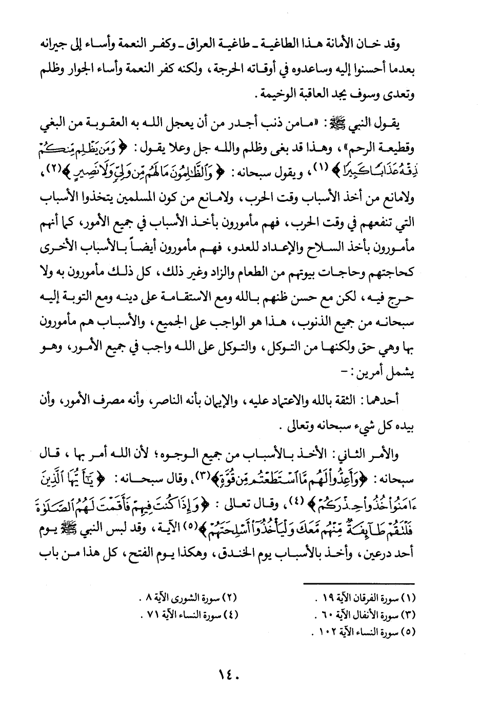 يقول النبي- صلى الله عليه وسلم -: «ما من ذنب أجدر من أن يعجل الله به العقوبة من البغي وقطيعة الرحم (¬1) » وهذا قد بغى وظلم، والله جل وعلا يقول: {وَمَنْ يَظْلِمْ مِنْكُمْ نُذِقْهُ عَذَابًا كَبِيرًا} (¬2) ويقول سبحانه: {وَالظَّالِمُونَ مَا لَهُمْ مِنْ وَلِيٍّ وَلَا نَصِيرٍ} (¬3) ولا مانع من أخذ الأسباب وقت الحرب، ولا مانع من كون المسلمين يتخذوا الأسباب التي تنفعهم في وقت الحرب، فهم مأمورون بأخذ الأسباب في جميع الأمور، كما أنهم مأمورون بأخذ السلاح والإعداد للعدو، فهم مأمورون أيضا بالأسباب الأخرى كحاجتهم وحاجات بيوتهم من الطعام والزاد وغير ذلك.