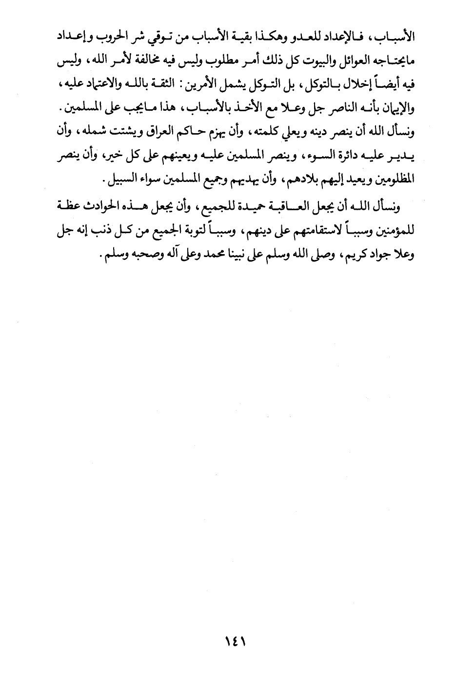 ونسأل الله أن ينصر دينه ويعلي كلمته، وأن يهزم حاكم العراق ويشتت شمله، وأن يدير عليه دائرة السوء، وينصر المسلمين عليه ويعينهم على كل خير، وأن ينصر المظلومين ويعيد إليهم بلادهم، وأن يهديهم وجميع المسلمين سواء السبيل.