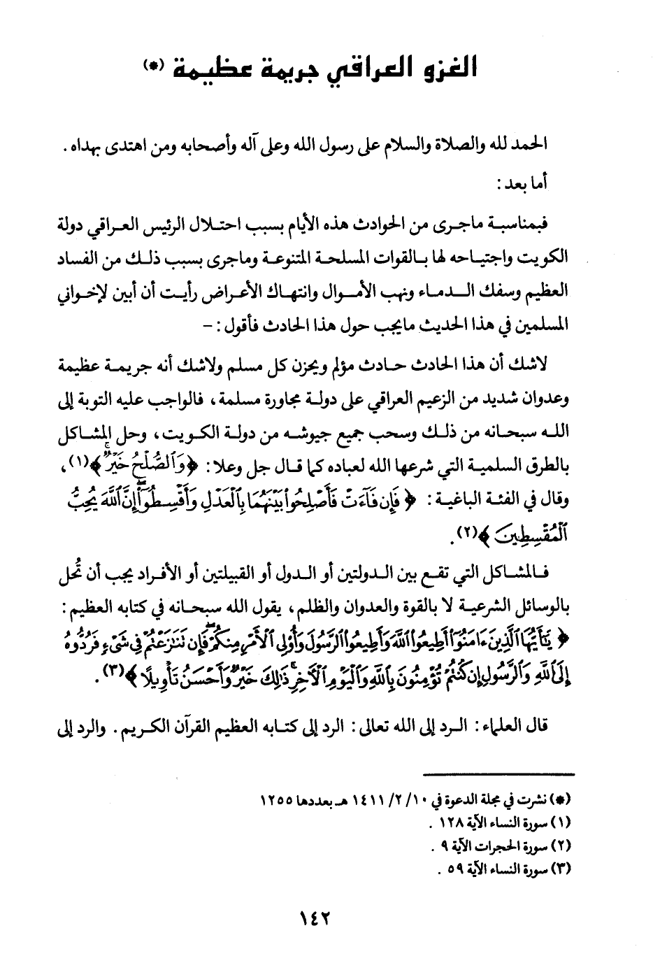 لا شك أن هذا الحادث حادث مؤلم، ويحزن كل مسلم، ولا شك أنه جريمة عظيمة وعدوان شديد من الزعيم العراقي على دولة مجاورة مسلمة، فالواجب عليه التوبة إلى الله سبحانه من ذلك، وسحب جميع جيوشه من دولة الكويت، وحل المشاكل بالطرق السلمية التي شرعها الله لعباده، كما قال جل وعلا: {وَالصُّلْحُ خَيْرٌ} (¬2) وقال في الفئة الباغية: {فَإِنْ فَاءَتْ فَأَصْلِحُوا بَيْنَهُمَا بِالْعَدْلِ وَأَقْسِطُوا إِنَّ اللَّهَ يُحِبُّ الْمُقْسِطِينَ} (¬3)