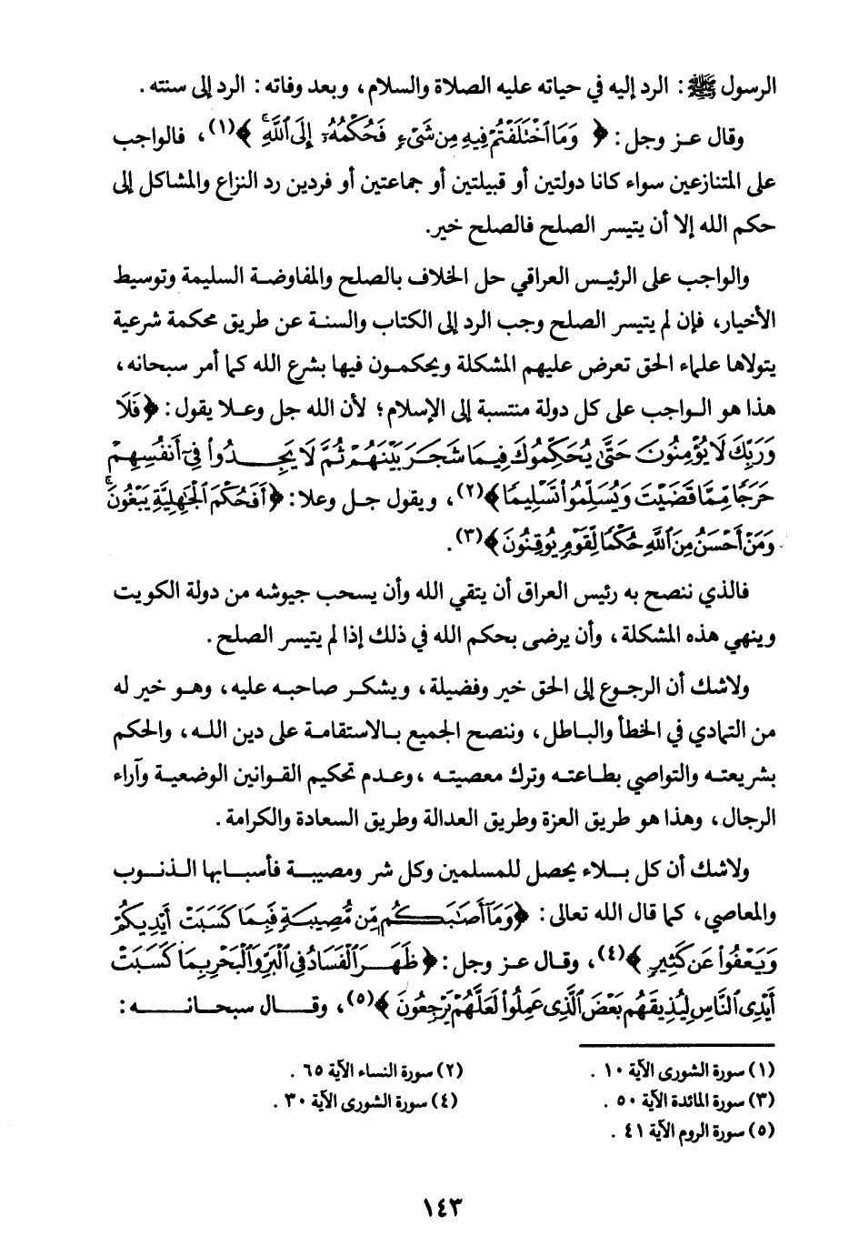 والواجب على الرئيس العراقي حل الخلاف بالصلح والمفاوضة السلمية وتوسيط الأخيار، فإن لم يتيسر الصلح وجب الرد إلى الكتاب والسنة عن طريق محكمة شرعية يتولاها علماء الحق، تعرض عليهم المشكلة ويحكمون فيها بشرع الله كما أمر سبحانه، هذا هو الواجب على كل دولة منتسبة إلى الإسلام؛ لأن الله جل وعلا يقول: {فَلَا وَرَبِّكَ لَا يُؤْمِنُونَ حَتَّى يُحَكِّمُوكَ فِيمَا شَجَرَ بَيْنَهُمْ ثُمَّ لَا يَجِدُوا فِي أَنْفُسِهِمْ حَرَجًا مِمَّا قَضَيْتَ وَيُسَلِّمُوا تَسْلِيمًا} (¬2) ويقول جل وعلا: {أَفَحُكْمَ الْجَاهِلِيَّةِ يَبْغُونَ وَمَنْ أَحْسَنُ مِنَ اللَّهِ حُكْمًا لِقَوْمٍ يُوقِنُونَ} (¬3) فالذي ننصح به رئيس العراق أن يتقي الله وأن يسحب جيوشه من دولة الكويت وينهي هذه المشكلة، وأن يرضى بحكم الله في ذلك إذا لم يتيسر الصلح.