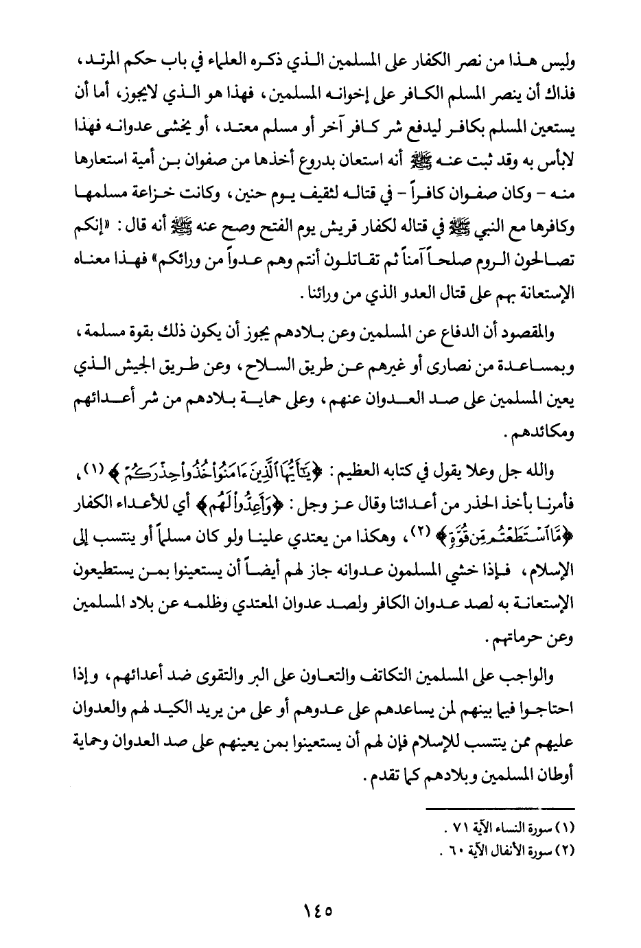 والله جل وعلا يقول في كتابه العظيم: {يَا أَيُّهَا الَّذِينَ آمَنُوا خُذُوا حِذْرَكُمْ} (¬2) فأمرنا بأخذ الحذر من أعدائنا وقال عز وجل: {مَا اسْتَطَعْتُمْ مِنْ قُوَّةٍ} (¬3) وهكذا من يعتدي علينا ولو كان مسلما أو ينتسب إلى الإسلام، فإذا خشي المسلمون عدوانه جاز لهم أيضا أن يستعينوا بمن يستطيعون الاستعانة به لصد عدوان الكافر ولصد عدوان المعتدي وظلمه عن بلاد المسلمين وعن حرماتهم، والواجب على المسلمين التكاتف والتعاون على البر والتقوى ضد أعدائهم، وإذا احتاجوا فيما بينهم لمن يساعدهم على عدوهم أو على من يريد الكيد لهم والعدوان عليهم ممن ينتسب للإسلام، فإن لهم أن يستعينوا بمن يعينهم على صد العدوان وحماية أوطان المسلمين وبلادهم كما تقدم.