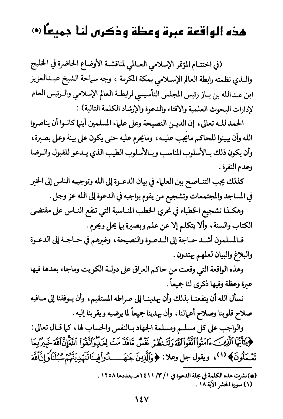 (في اختتام المؤتمر الإسلامي العالمي لمناقشة الأوضاع الحاضرة في الخليج والذي نظمته رابطة العالم الإسلامي بمكة المكرمة، وجه سماحة الشيخ عبد العزيز بن عبد الله بن باز رئيس المجلس التأسيسي لرابطة العالم الإسلامي والرئيس العام لإدارات البحوث العلمية والإفتاء والدعوة والإرشاد الكلمة التالية) :