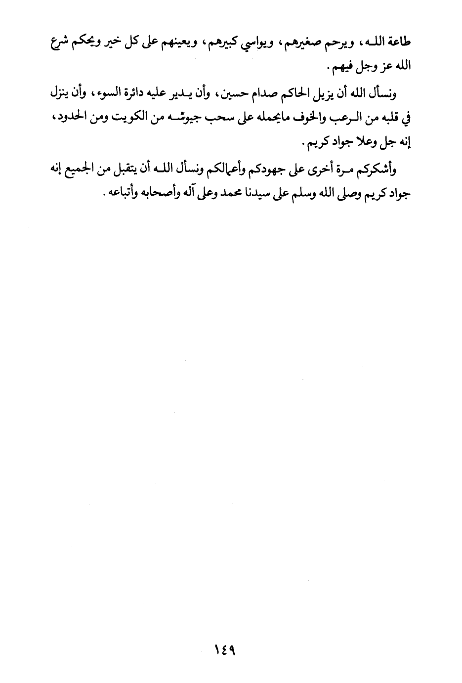 ونسأل الله أن يزيل الحاكم صدام حسين، وأن يدير عليه دائرة السوء، وأن ينزل في قلبه من الرعب والخوف ما يحمله على سحب جيوشه من الكويت ومن الحدود، إنه جل وعلا جواد كريم.