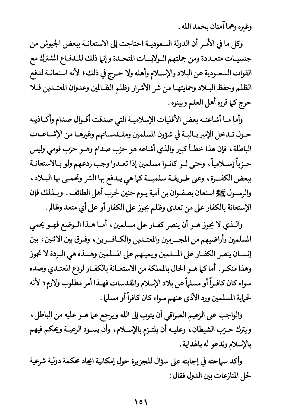 وكل ما في الأمر أن الدولة السعودية احتاجت إلى الاستعانة ببعض الجيوش من جنسيات متعددة، ومن جملتهم الولايات المتحدة، وإنما ذلك للدفاع المشترك مع القوات السعودية عن البلاد والإسلام وأهله، ولا حرج في ذلك؛ لأنه استعانة لدفع الظلم وحفظ البلاد وحمايتها من شر الأشرار وظلم الظالمين وعدوان المعتدين، فلا حرج كما قرره أهل العلم وبينوه. وأما ما أشاعته بعض الأقليات الإسلامية التي صدقت أقوال صدام وأكاذيبه حول تدخل الإمبريالية في شئون المسلمين ومقدساتهم وغيرها من الإشاعات الباطلة، فإن هذا خطأ كبير، والذي أشاعه هو حزب صدام وهو حزب قومي وليس حزبا إسلاميا، وحتى لو كانوا مسلمين إذا تعدوا وجب ردعهم ولو بالاستعانة ببعض الكفرة، وعلى طريقة سلمية كما هي يدفع بها الشر وتحمى بها البلاد، والرسول - صلى الله عليه وسلم - استعان بصفوان بن أمية يوم حنين لحرب أهل الطائف. وبذلك فإن الاستعانة بالكفار على من تعدى وظلم يجوز على الكفار أو على أي متعد وظالم، والذي لا يجوز هو أن ينصر كفار على مسلمين، أما هذا الوضع فهو يحمي المسلمين وأراضيهم من المجرمين والمعتدين والكافرين، وفرق بين الاثنين، بين إنسان ينصر الكفار على المسلمين ويعينهم على المسلمين وهذه هي الردة، لا تجوز، وهذا منكر. أما كما هو الحال بالمملكة من الاستعانة بالكفار لردع المعتدي وصده، سواء كان كافرا أو مسلما عن بلاد الإسلام والمقدسات فهذا أمر مطلوب ولازم؛ لأنه لحماية المسلمين ورد الأذى عنهم، سواء كان كافرا أو مسلما. والواجب على الزعيم العراقي أن يتوب إلى الله ويرجع عما هو عليه من الباطل، ويترك حزب الشيطان، وعليه أن يلتزم بالإسلام، وأن يسود الرعية ويحكم فيهم بالإسلام وندعو له بالهداية.