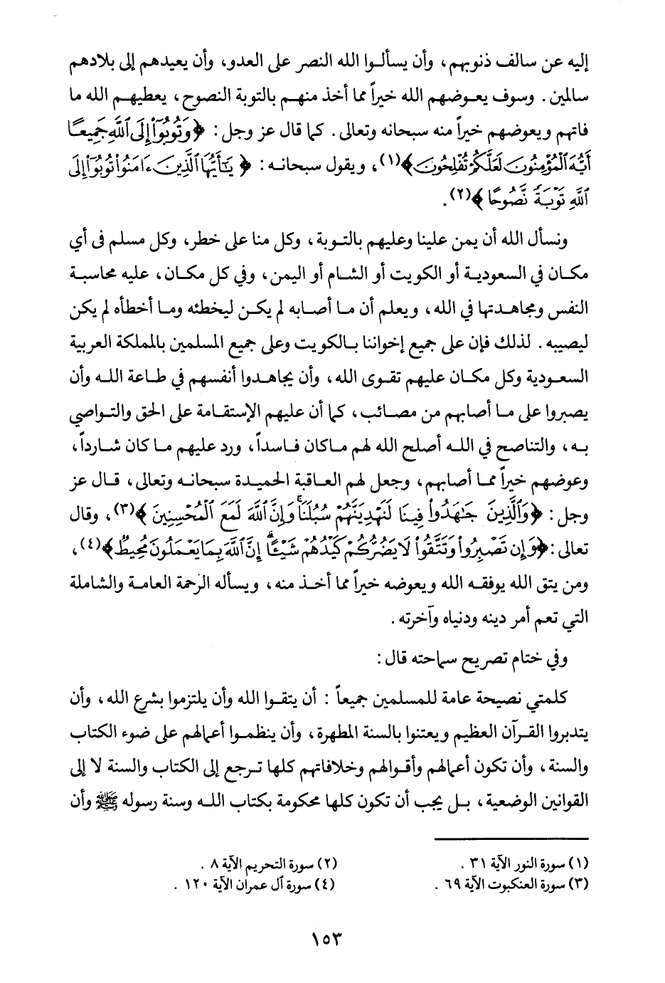 لذلك فإن على جميع إخواننا بالكويت وعلى جميع المسلمين بالمملكة العربية السعودية وكل مكان عليهم تقوى الله، وأن يجاهدوا أنفسهم في طاعة الله وأن يصبروا على ما أصابهم من مصائب، كما أن عليهم الاستقامة على الحق والتواصي به، والتناصح في الله، أصلح الله لهم ما كان فاسدا، ورد عليهم ما كان شاردا، وعوضهم خيرا مما أصابهم، وجعل لهم العاقبة الحميدة سبحانه وتعالى، قال عز وجل: {وَالَّذِينَ جَاهَدُوا فِينَا لَنَهْدِيَنَّهُمْ سُبُلَنَا وَإِنَّ اللَّهَ لَمَعَ الْمُحْسِنِينَ} (¬3) وقال تعالى: {وَإِنْ تَصْبِرُوا وَتَتَّقُوا لَا يَضُرُّكُمْ كَيْدُهُمْ شَيْئًا} (¬4) ومن يتق الله يوفقه الله ويعوضه خيرا مما أخذ منه، ويسأله الرحمة العامة والشاملة التي تعم أمر دينه ودنياه وآخرته.