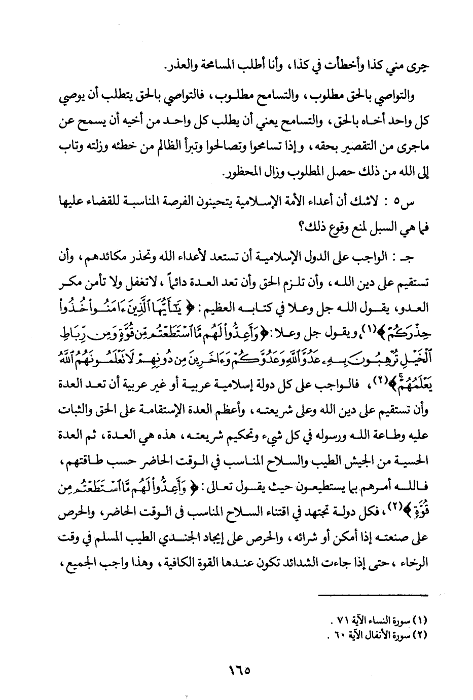 فالواجب على كل دولة إسلامية عربية أو غير عربية أن تعد العدة وأن تستقيم على دين الله وعلى شريعته، وأعظم العدة الاستقامة على الحق والثبات عليه وطاعة الله ورسوله في كل شيء وتحكيم شريعته، هذه هي العدة، ثم العدة الحسية من الجيش الطيب والسلاح المناسب في الوقت الحاضر حسب طاقتهم، فالله أمرهم بما يستطيعون، حيث يقول تعالى: {وَأَعِدُّوا لَهُمْ مَا اسْتَطَعْتُمْ مِنْ قُوَّةٍ} (¬3) فكل دولة تجتهد في اقتناء السلاح المناسب في الوقت الحاضر، والحرص على صنعته إذا أمكن أو شرائه، والحرص على إيجاد الجندي الطيب المسلم في وقت الرخاء، حتى إذا جاءت الشدائد تكون عندها القوة الكافية، وهذا واجب الجميع،