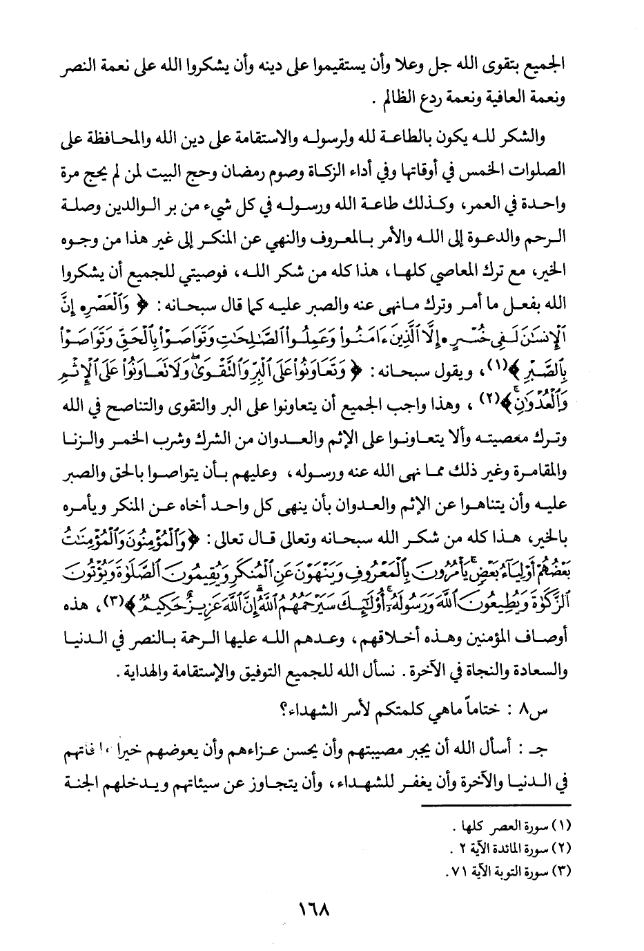 ويقول سبحانه: {وَتَعَاوَنُوا عَلَى الْبِرِّ وَالتَّقْوَى وَلَا تَعَاوَنُوا عَلَى الْإِثْمِ وَالْعُدْوَانِ} (¬4) وهذا واجب الجميع أن يتعاونوا على البر والتقوى والتناصح في الله وترك معصيته وألا يتعاونوا على الإثم والعدوان من الشرك وشرب الخمر والزنا والمقامرة وغير ذلك مما نهى الله عنه ورسوله، وعليهم بأن يتواصوا بالحق والصبر عليه، وأن يتناهوا عن الإثم والعدوان بأن ينهى كل واحد أخاه عن المنكر ويأمره بالخير، هذا كله من شكر الله سبحانه وتعالى، قال تعالى: {وَالْمُؤْمِنُونَ وَالْمُؤْمِنَاتُ بَعْضُهُمْ أَوْلِيَاءُ بَعْضٍ يَأْمُرُونَ بِالْمَعْرُوفِ وَيَنْهَوْنَ عَنِ الْمُنْكَرِ وَيُقِيمُونَ الصَّلَاةَ وَيُؤْتُونَ الزَّكَاةَ وَيُطِيعُونَ اللَّهَ وَرَسُولَهُ أُولَئِكَ سَيَرْحَمُهُمُ اللَّهُ إِنَّ اللَّهَ عَزِيزٌ حَكِيمٌ} (¬5) هذه أوصاف المؤمنين وهذه أخلاقهم، وعدهم الله عليها الرحمة بالنصر في الدنيا والسعادة والنجاة في الآخرة.