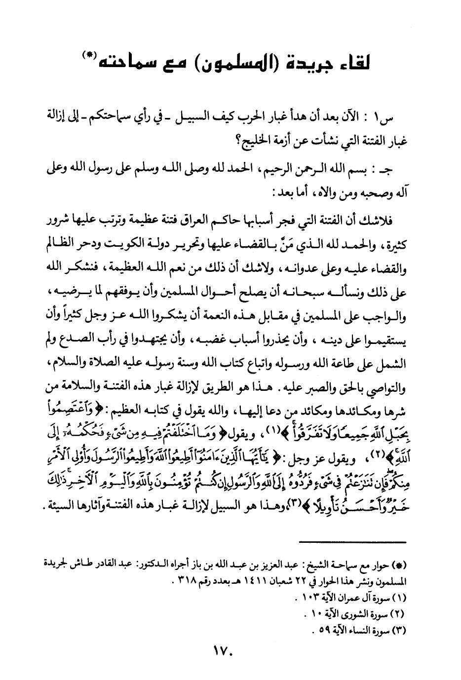 س1: الآن بعد أن هدأ غبار الحرب كيف السبيل- في رأي سماحتكم- إلى إزالة غبار الفتنة التي نشأت عن أزمة الخليج؟