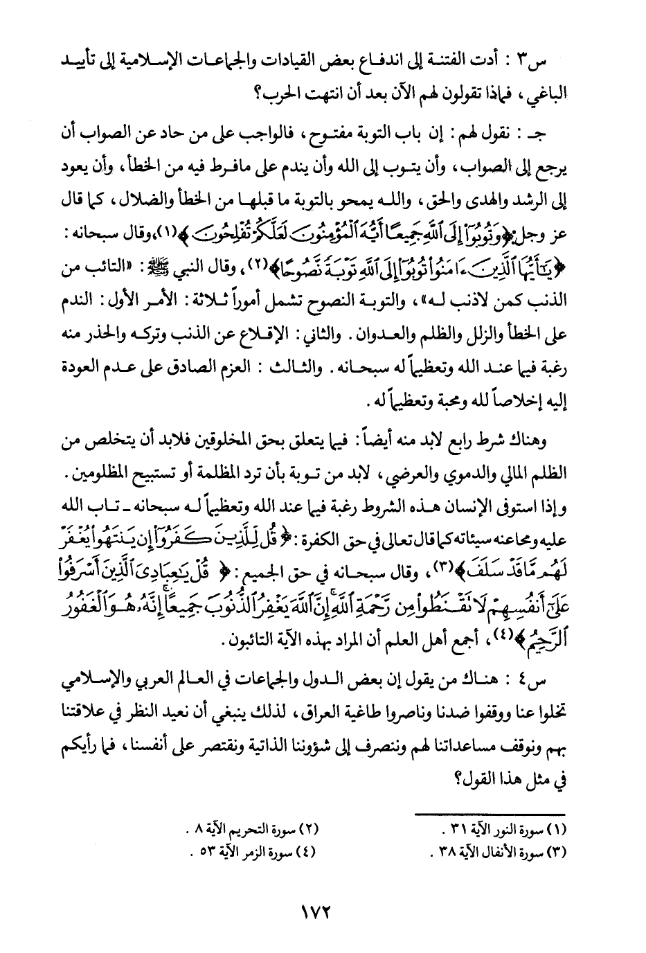 س 4: هناك من يقول إن بعض الدول والجماعات في العالم العربي والإسلامي تخلوا عنا ووقفوا ضدنا وناصروا طاغية العراق، لذلك ينبغي أن نعيد النظر في علاقتنا بهم ونوقف مساعداتنا لهم وننصرف إلى شئوننا الذاتية ونقتصر على أنفسنا، فما رأيكم في مثل هذا القول؟