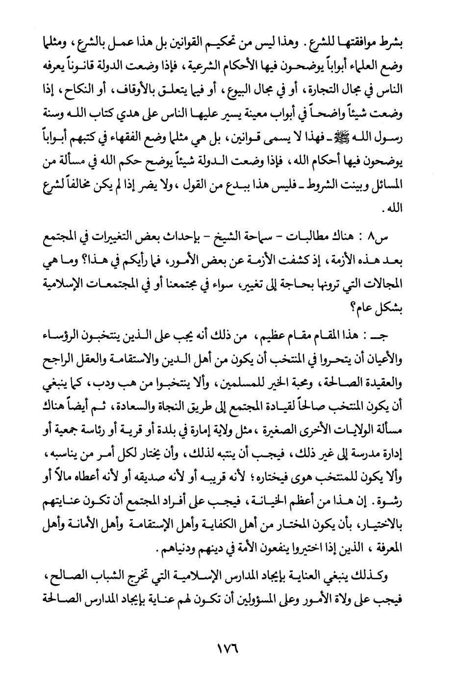 وهذا ليس من تحكيم القوانين بل هذا عمل بالشرع، ومثلما وضع العلماء أبوابا يوضحون فيها الأحكام الشرعية، فإذا وضعت الدولة قانونا يعرفه الناس في مجال التجارة، أو في مجال البيوع، أو فيما يتعلق بالأوقاف، أو النكاح، إذا وضعت شيئا واضحا في أبواب معينة يسير عليها الناس على هدي كتاب الله وسنة رسول الله صلى الله عليه وسلم - فهذا لا يسمى قوانين، بل هي مثلما وضع الفقهاء في كتبهم أبوابا يوضحون فيها أحكام الله، فإذا وضعت الدولة شيئا يوضح حكم الله في مسألة من المسائل وبينت الشروط فليس هذا ببدع من القول ولا يضر إذا لم يكن مخالفا لشرع الله.