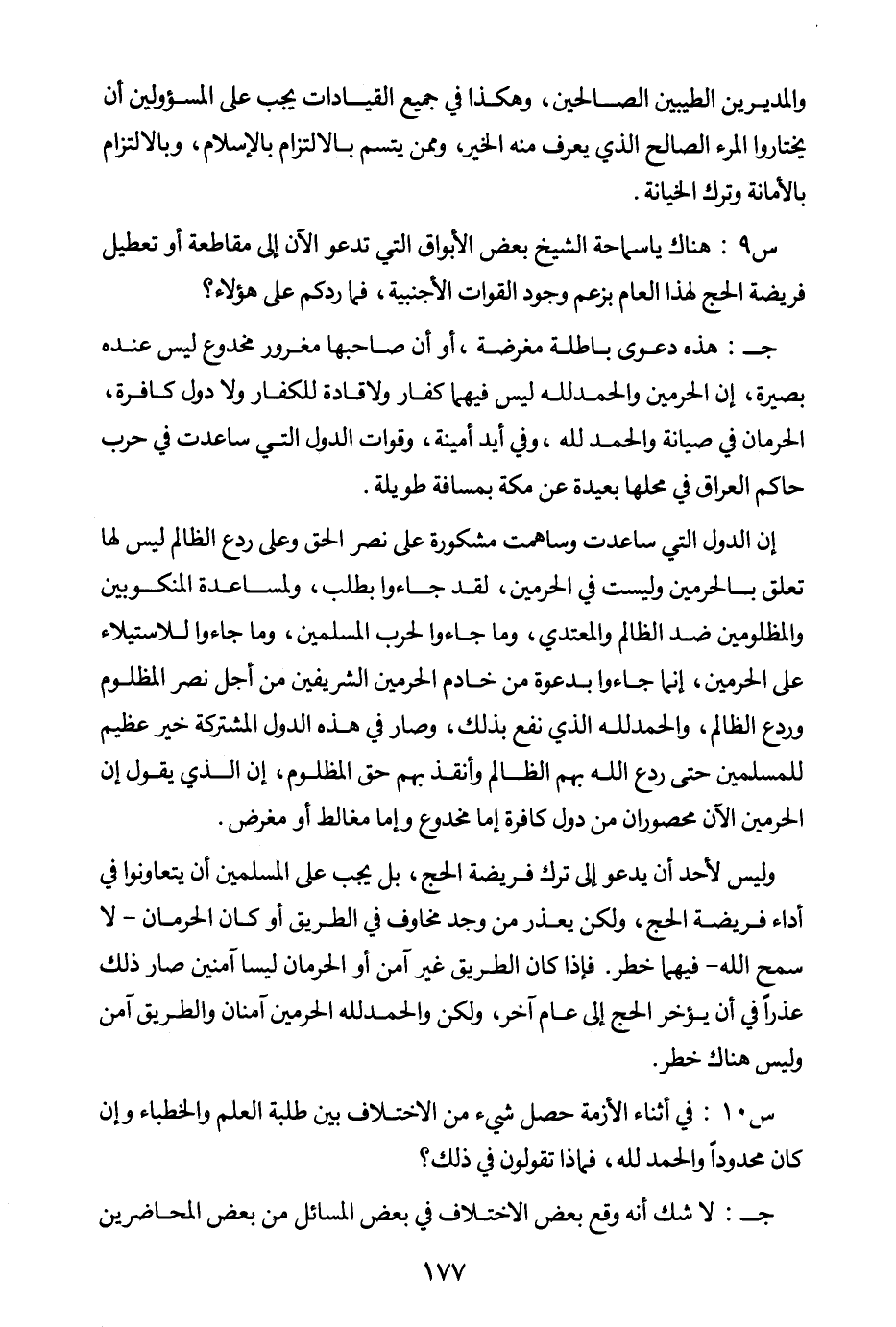 إن الدول التي ساعدت وساهمت مشكورة على نصر الحق وعلى ردع الظالم ليس لها تعلق بالحرمين وليست في الحرمين، لقد جاءوا بطلب، ولمساعدة المنكوبين والمظلومين ضد الظالم والمعتدي، وما جاءوا لحرب المسلمين، وما جاءوا للاستيلاء على الحرمين، إنما جاءوا بدعوة من خادم الحرمين الشريفين من أجل نصر المظلوم وردع الظالم، والحمد لله الذي نفع بذلك، وصار في هذه الدول المشركة خير عظيم للمسلمين حتى ردع الله بهم الظالم وأنقذ بهم حق المظلوم، إن الذي يقول إن الحرمين الآن محصوران من دول كافرة إما مخدوع وإما مغالط أو مغرض. وليس لأحد أن يدعو إلى ترك فريضة الحج، بل يجب على المسلمين أن يتعاونوا في أداء فريضة الحج، ولكن يعذر من وجد مخاوف في الطريق أو كان الحرمان - لا سمح الله - فيهما خطر.