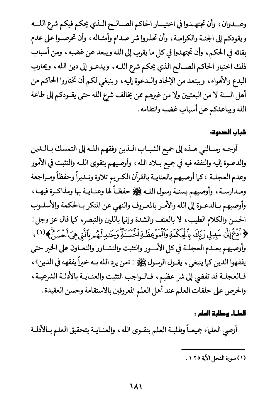 أوجه رسالتي هذه إلى جميع الشباب الذين وفقهم الله إلى التمسك بالدين والدعوة إليه والتفقه فيه في جميع بلاد الله، وأوصيهم بتقوى الله والتثبت في الأمور وعدم العجلة، كما أوصيهم بالعناية بالقرآن الكريم تلاوة وتدبرا وحفظا ومراجعة ومدارسة، وأوصيهم بسنة رسول الله صلى الله عليه وسلم حفظا لها وعناية بها ومذاكرة فيها، وأوصيهم بالدعوة إلى الله والأمر بالمعروف والنهي عن المنكر بالحكمة والأسلوب الحسن والكلام الطيب، لا بالعنف والشدة وإنما باللين والتبصر، كما قال عز وجل: {ادْعُ إِلَى سَبِيلِ رَبِّكَ بِالْحِكْمَةِ وَالْمَوْعِظَةِ الْحَسَنَةِ وَجَادِلْهُمْ بِالَّتِي هِيَ أَحْسَنُ} (¬1) وأوصيهم بعدم العجلة في كل الأمور والتثبت والتشاور والتعاون على الخير حتى يفقهوا الدين كما ينبغي، يقول الرسول صلى الله عليه وسلم: «من يرد الله به خيرا يفقهه في الدين (¬2) » فالعجلة قد تفضي إلى شر عظيم، فالواجب التثبت والعناية بالأدلة الشرعية، والحرص على حلقات العلم عند أهل العلم المعروفين بالاستقامة وحسن العقيدة.
