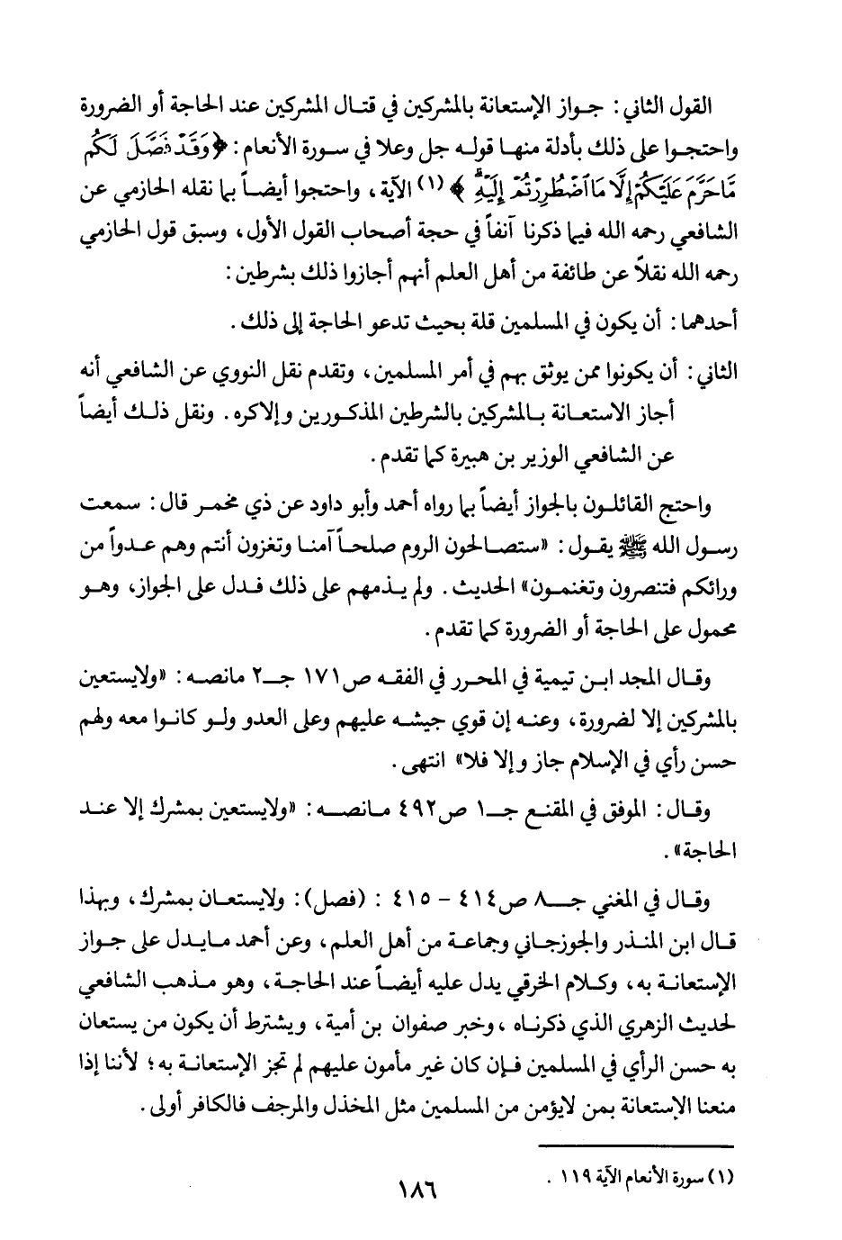 وقال: الموفق في المقنع ج1 ص492 ما نصه: ولا يستعين بمشرك إلا عند الحاجة.