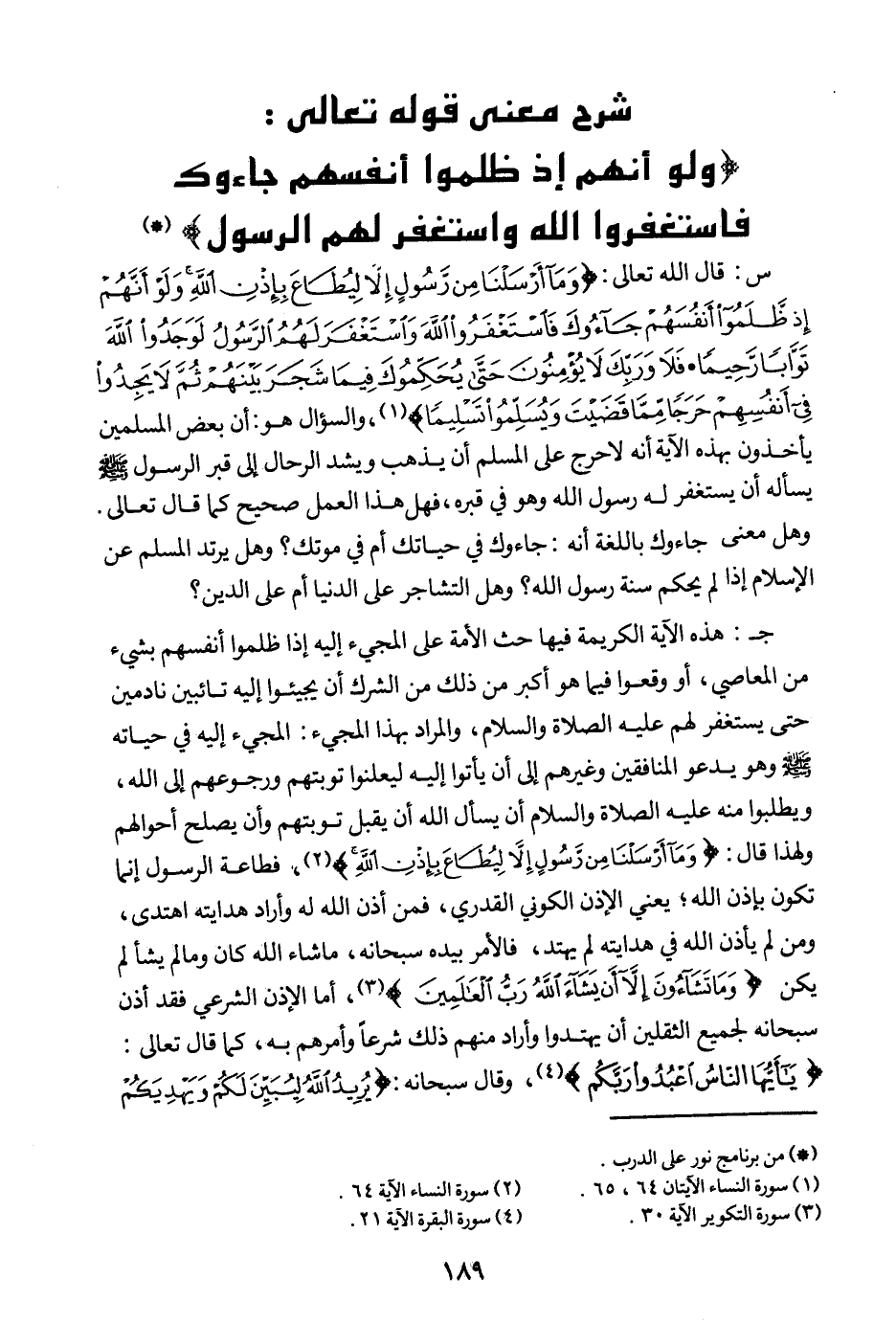ج: هذه الآية الكريمة فيها حث الأمة على المجيء إليه إذا ظلموا أنفسهم بشيء من المعاصي، أو وقعوا فيما هو أكبر من ذلك من الشرك أن يجيئوا إليه تائبين نادمين حتى يستغفر لهم عليه الصلاة والسلام، والمراد بهذا المجيء: المجيء إليه في حياته صلى الله عليه وسلم وهو يدعو المنافقين وغيرهم إلى أن يأتوا إليه ليعلنوا توبتهم ورجوعهم إلى الله، ويطلبوا منه عليه الصلاة والسلام أن يسأل الله أن يقبل توبتهم وأن يصلح أحوالهم، ولهذا قال: {وَمَا أَرْسَلْنَا مِنْ رَسُولٍ إِلَّا لِيُطَاعَ بِإِذْنِ اللَّهِ} (¬4) فطاعة الرسول إنما تكون بإذن الله. يعني الإذن الكوني القدري، فمن أذن الله له وأراد هدايته اهتدى، ومن لم يأذن الله في هدايته لم يهتد، فالأمر بيده سبحانه، ما شاء الله كان وما لم يشأ لم يكن {وَمَا تَشَاءُونَ إِلَّا أَنْ يَشَاءَ اللَّهُ رَبُّ الْعَالَمِينَ} (¬5)