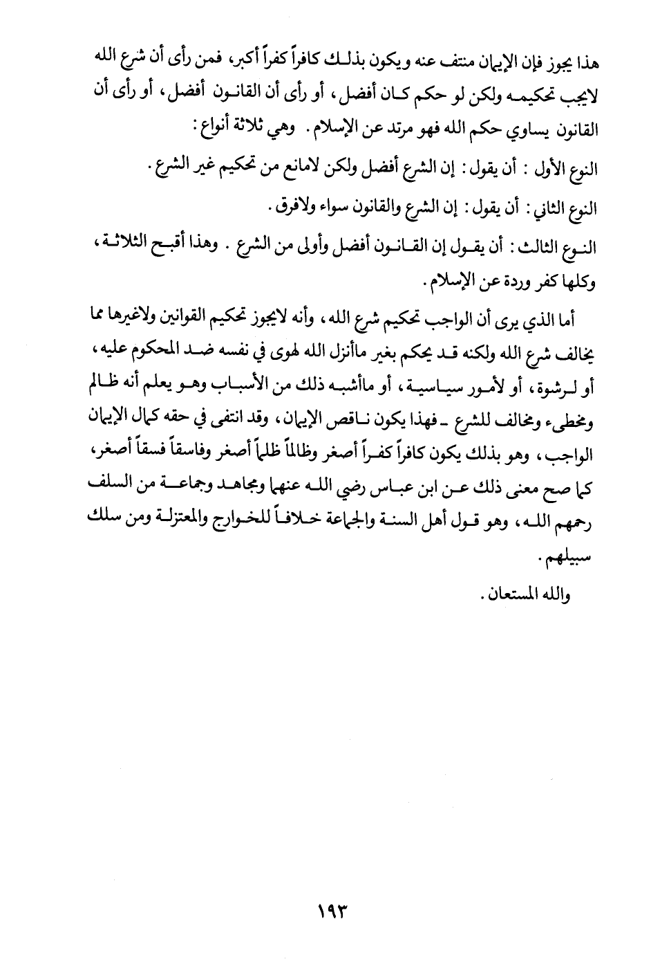 هذا يجوز فإن الإيمان منتف عنه ويكون بذلك كافرا كفرا أكبر، فمن رأى أن شرع الله لا يجب تحكيمه ولكن لو حكم كان أفضل، أو رأى أن القانون أفضل، أو رأى أن القانون يساوي حكم الله فهو مرتد عن الإسلام. وهي ثلاثة أنواع:.