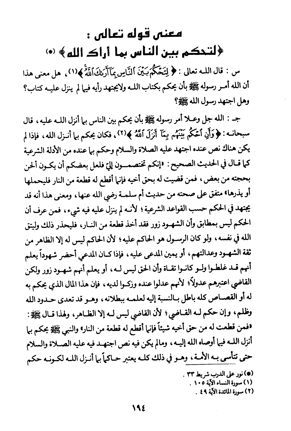 س: قال الله تعالى: {لِتَحْكُمَ بَيْنَ النَّاسِ بِمَا أَرَاكَ اللَّهُ} (¬2) هل معنى هذا أن الله أمر رسوله صلى الله عليه وسلم بأن يحكم بكتاب الله ولا يجتهد رأيه فيما لم ينزل عليه كتاب؟ وهل اجتهد رسول الله صلى الله عليه وسلم؟