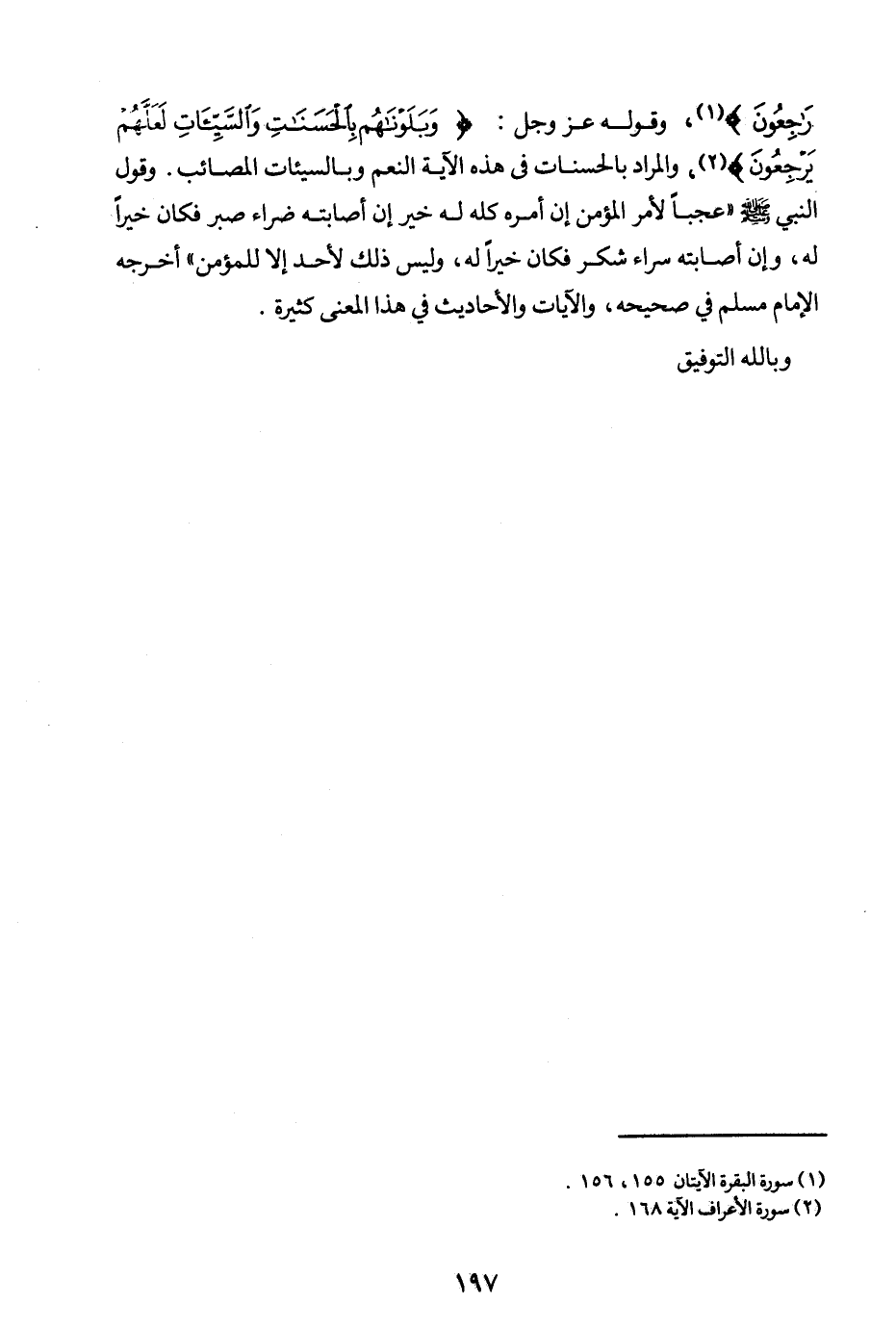وقوله عز وجل: {وَبَلَوْنَاهُمْ بِالْحَسَنَاتِ وَالسَّيِّئَاتِ لَعَلَّهُمْ يَرْجِعُونَ} (¬1) والمراد بالحسنات في هذه الآية النعم، وبالسيئات المصائب. وقول النبي صلى الله عليه وسلم: «عجبا لأمر المؤمن إن أمره كله له خير إن أصابته ضراء صبر فكان خيرا له وإن أصابته سراء شكر فكان خيرا له وليس ذلك لأحد إلا للمؤمن (¬2) » أخرجه الإمام مسلم في صحيحه.