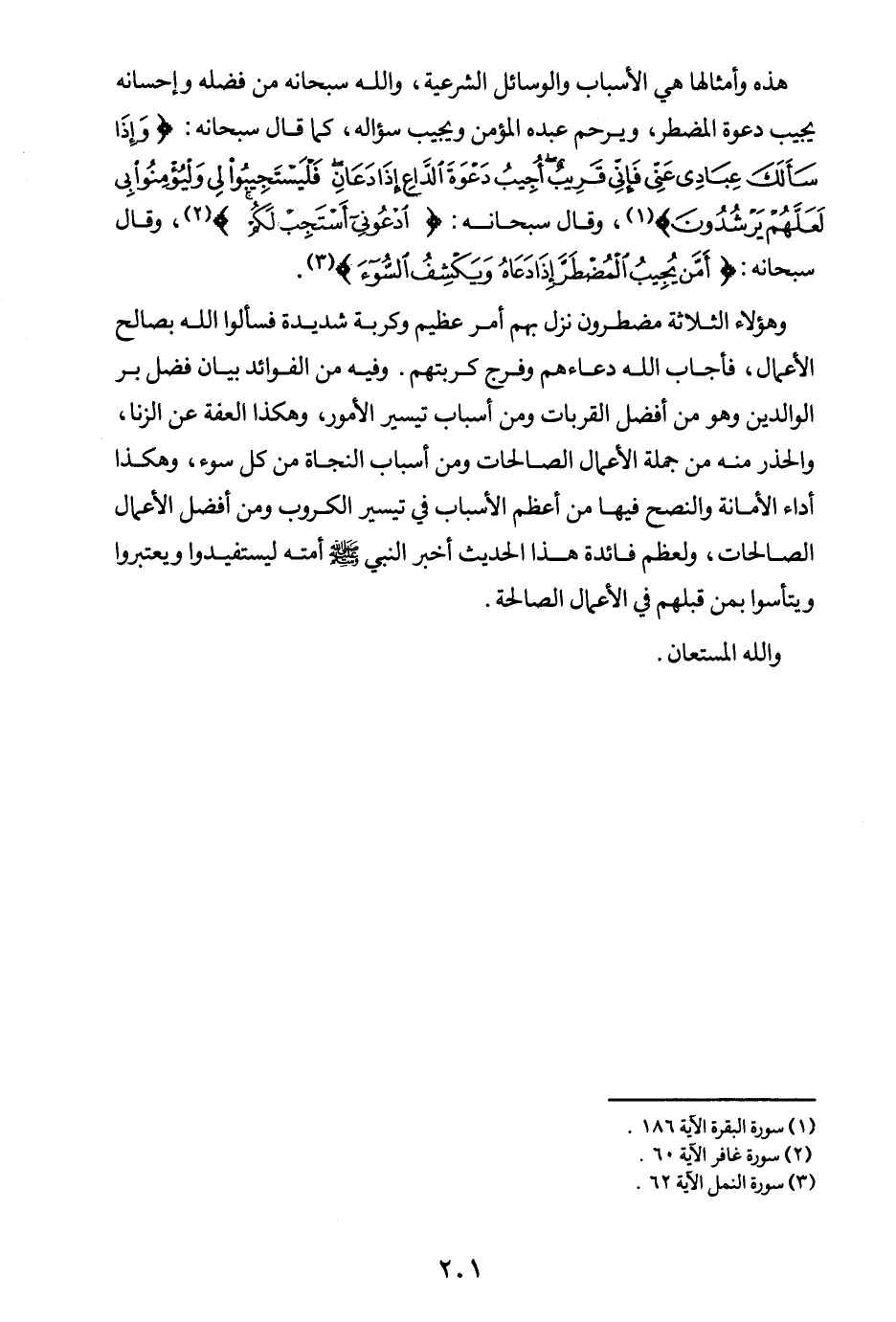 وهؤلاء الثلاثة مضطرون نزل بهم أمر عظيم وكربة شديدة فسألوا الله بصالح الأعمال، فأجاب الله دعاءهم وفرج كربتهم. وفيه من الفوائد بيان فضل بر الوالدين، وهو من أفضل القربات، ومن أسباب تيسير الأمور، وهكذا العفة عن الزنا، والحذر منه من جملة الأعمال الصالحات ومن أسباب النجاة من كل سوء، وهكذا أداء الأمانة والنصح فيها من أعظم الأسباب في تيسير الكروب ومن أفضل الأعمال الصالحات، ولعظم فائدة هذا الحديث أخبر النبي أمته ليستفيدوا ويعتبروا ويتأسوا بمن قبلهم في الأعمال الصالحة. والله المستعان.