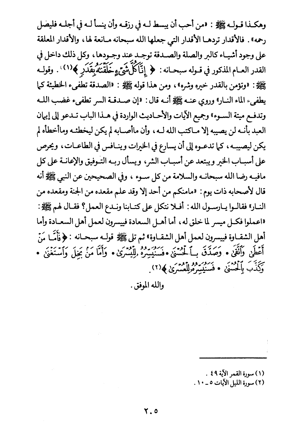 فالأقدار تردها الأقدار التي جعلها الله سبحانه مانعة لها، والأقدار المعلقة على وجود أشياء كالبر والصلة والصدقة توجد عند وجودها، وكل ذلك داخل في القدر العام المذكور في قوله سبحانه: {إِنَّا كُلَّ شَيْءٍ خَلَقْنَاهُ بِقَدَرٍ} (¬2) وقوله: «وتؤمن بالقدرخيره وشره (¬3) » ومن هذا قوله: «الصدقة تطفئ الخطيئة كما يطفئ الماء النار (¬4) » وروي عنه أنه قال: «إن صدقة السر تطفئ غضب الله وتدفع ميتة السوء» وجميع الآيات والأحاديث الواردة في هذا الباب تدعو إلى إيمان العبد بأنه لن يصيبه إلا ما كتب الله له، وأن ما أصابه لم يكن ليخطئه وما أخطأه لم يكن ليصيبه، كما تدعوه إلى أن يسارع في الخيرات وينافس في الطاعات، ويحرص على أسباب الخير ويبتعد عن أسباب الشر، ويسأل ربه التوفيق والإعانة على كل ما فيه رضا الله سبحانه والسلامة من كل سوء.