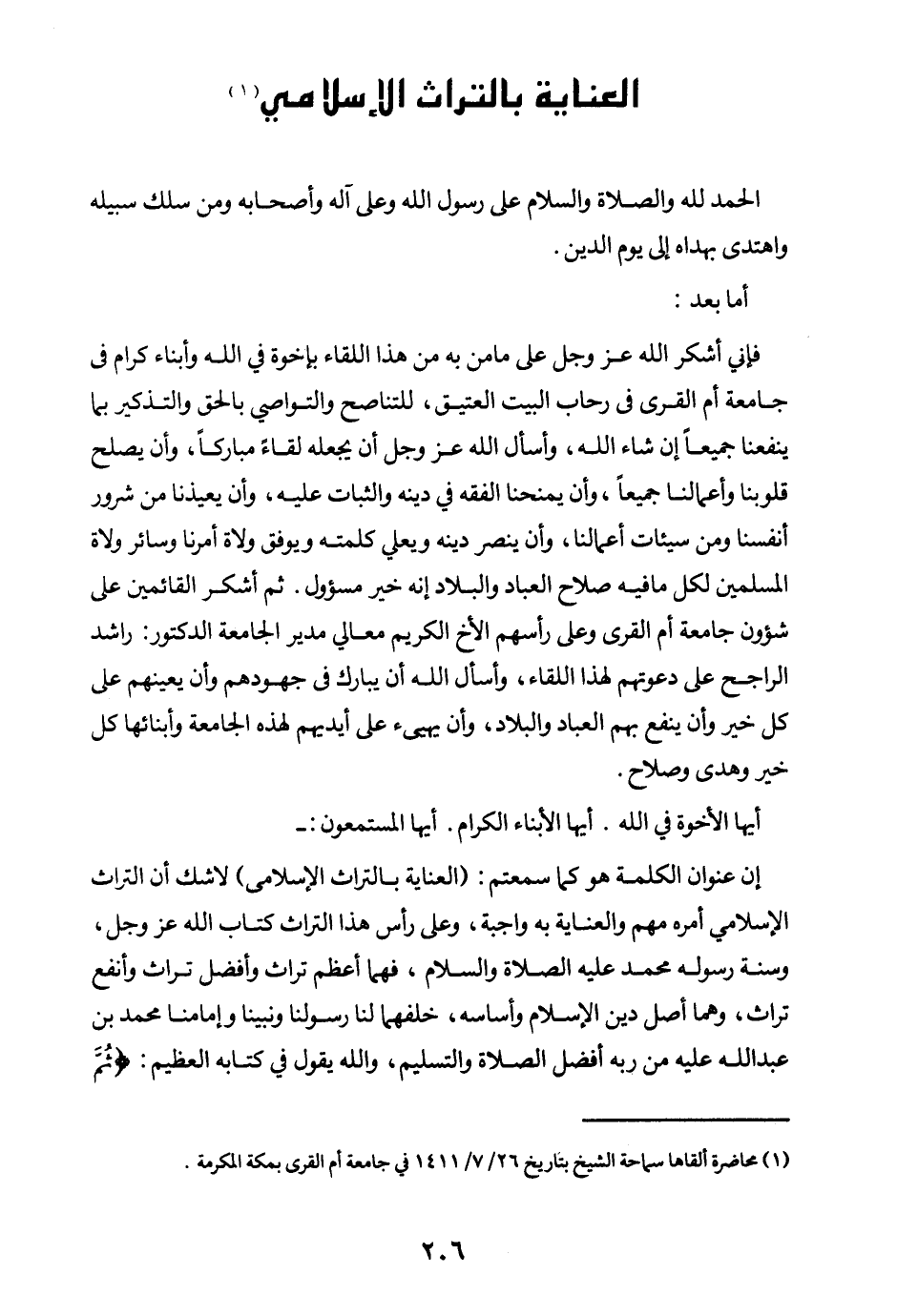 (¬1) محاضرة ألقاها سماحة الشيخ بتاريخ 26\7\1411 هـ في جامعة أم القرى بمكة المكرمة.