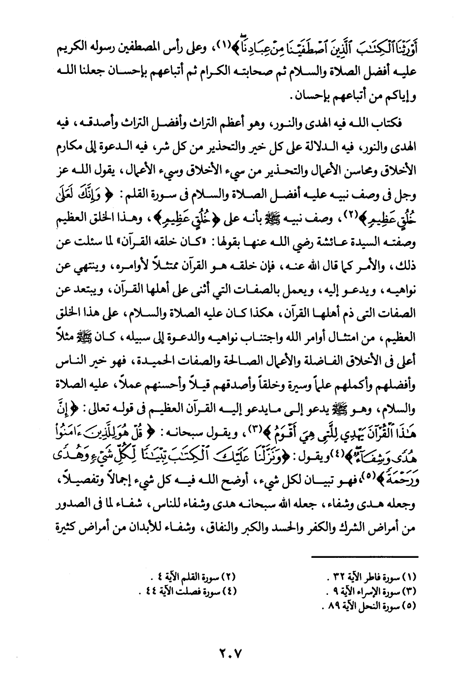 فكتاب الله فيه الهدى والنور، وهو أعظم التراث وأفضل التراث وأصدقه، فيه الهدى والنور، فيه الدلالة على كل خير والتحذير من كل شر، فيه الدعوة إلى مكارم الأخلاق ومحاسن الأعمال والتحذير من سيئ الأخلاق وسيئ الأعمال، يقول الله عز وجل في وصف نبيه عليه أفضل الصلاة والسلام في سورة القلم: {وَإِنَّكَ لَعَلى خُلُقٍ عَظِيمٍ} (¬2) وصف نبيه بأنه على {خُلُقٍ عَظِيمٍ} (¬3) وهذا الخلق العظيم وصفته السيدة عائشة رضي الله عنها بقولها: «كان خلقه القرآن (¬4) » لما سئلت عن ذلك، والأمر كما قال الله عنه، فإن خلقه هو القرآن ممتثلا لأوامره، وينتهي عن نواهيه، ويدعو إليه، ويعمل بالصفات التي أثنى على أهلها القرآن، ويبتعد عن الصفات التي ذم أهلها القرآن، هكذا كان عليه الصلاة والسلام، على هذا الخلق العظيم، من امتثال أوامر الله واجتناب نواهيه والدعوة إلى سبيله، كان مثلا أعلى في الأخلاق الفاضلة والأعمال الصالحة والصفات الحميدة، فهو خير الناس وأفضلهم وأكملهم علما وسيرة وخلقا وأصدقهم قيلا وأحسنهم عملا، عليه الصلاة والسلام، وهو يدعو إلى ما يدعو إليه القرآن العظيم في قوله تعالى: {إِنَّ هَذَا الْقُرْآنَ يَهْدِي لِلَّتِي هِيَ أَقْوَمُ} (¬5)