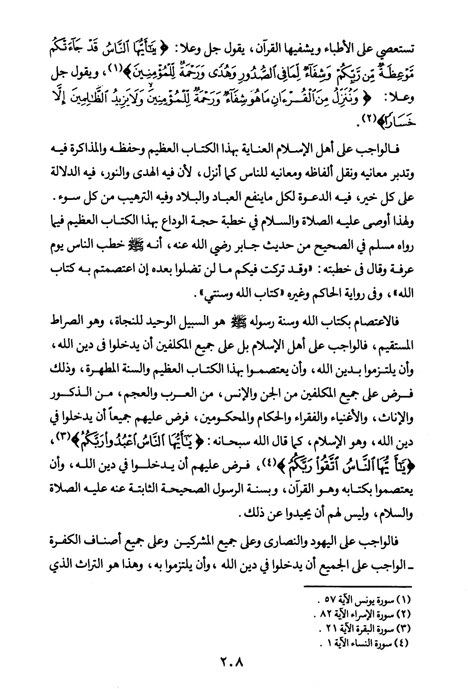 فالاعتصام بكتاب الله وسنة رسوله هو السبيل الوحيد للنجاة، وهو الصراط المستقيم، فالواجب على أهل الإسلام بل على جميع المكلفين أن يدخلوا في دين الله، وأن يلتزموا بدين الله، وأن يعتصموا بهذا الكتاب العظيم والسنة المطهرة، وذلك فرض على جميع المكلفين من الجن والإنس، من العرب والعجم، من الذكور والإناث، والأغنياء والفقراء والحكام والمحكومين، فرض عليهبم جميعا أن يدخلوا في دين الله، وهو الإسلام، كما قال الله سبحانه: {يَا أَيُّهَا النَّاسُ اعْبُدُوا رَبَّكُمُ} (¬4) ، {يَا أَيُّهَا النَّاسُ اتَّقُوا رَبَّكُمُ} (¬5) فرض عليهم أن يدخلوا في دين الله، وأن يعتصموا بكتابه وهو القرآن، وبسنة الرسول الصحيحة الثابتة عنه عليه الصلاة والسلام، وليس لهم أن يحيدوا عن ذلك.