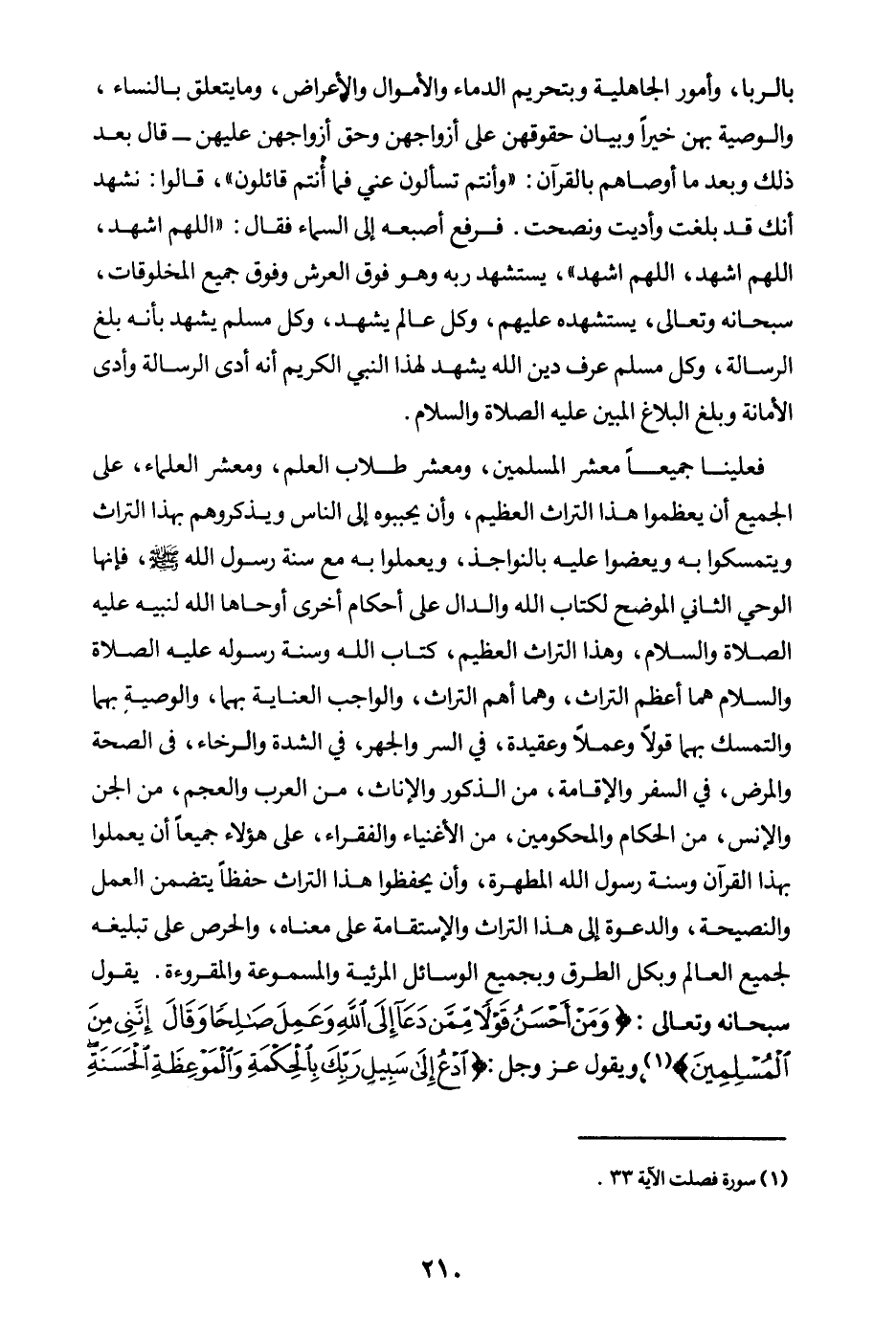 فعلينا جميعا معشر المسلمين، ومعشر طلاب العلم، ومعشر العلماء، على الجميع أن يعظموا هذا التراث العظيم، وأن يحببوه إلى الناس ويذكروهم بهذا التراث، ويتمسكوا به ويعضوا عليه بالنواجذ، ويعملوا به مع سنة رسول الله، فإنها الوحي الثاني الموضح لكتاب الله والدال على أحكام أخرى أوحاها الله لنبيه عليه الصلاة والسلام.