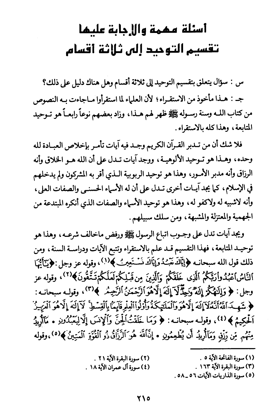 ويجد آيات تدل على وجوب اتباع الرسول ورفض ما خالف شرعه، وهذا هو توحيد المتابعة، فهذا التقسيم قد علم بالاستقراء وتتبع الآيات ودراسة السنة، ومن ذلك قول الله سبحانه: {إِيَّاكَ نَعْبُدُ وَإِيَّاكَ نَسْتَعِينُ} (¬1) وقوله عز وجل: {يَا أَيُّهَا النَّاسُ اعْبُدُوا رَبَّكُمُ الَّذِي خَلَقَكُمْ وَالَّذِينَ مِنْ قَبْلِكُمْ لَعَلَّكُمْ تَتَّقُونَ} (¬2) وقوله عز وجل: {وَإِلَهُكُمْ إِلَهٌ وَاحِدٌ لَا إِلَهَ إِلَّا هُوَ الرَّحْمَنُ الرَّحِيمُ} (¬3) وقوله سبحانه: {شَهِدَ اللَّهُ أَنَّهُ لَا إِلَهَ إِلَّا هُوَ وَالْمَلَائِكَةُ وَأُولُو الْعِلْمِ قَائِمًا بِالْقِسْطِ لَا إِلَهَ إِلَّا هُوَ الْعَزِيزُ الْحَكِيمُ} (¬4) وقوله سبحانه: {وَمَا خَلَقْتُ الْجِنَّ وَالْإِنْسَ إِلَّا لِيَعْبُدُونِ} (¬5) {مَا أُرِيدُ مِنْهُمْ مِنْ رِزْقٍ وَمَا أُرِيدُ أَنْ يُطْعِمُونِ} (¬6) {إِنَّ اللَّهَ هُوَ الرَّزَّاقُ ذُو الْقُوَّةِ الْمَتِينُ} (¬7) وقوله