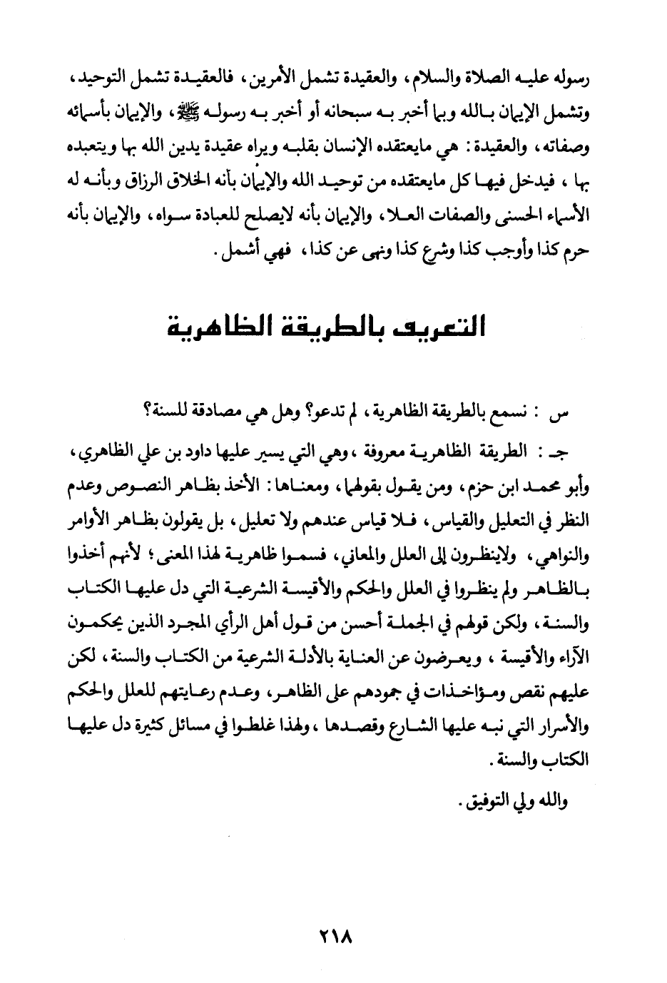 جـ: الطريقة الظاهرية معروفة، وهي التي يسير عليها داود بن علي الظاهري، وأبو محمد ابن حزم، ومن يقول بقولهما، ومعناها: الأخذ بظاهر النصوص وعدم النظر في التعليل والقياس، فلا قياس عندهم ولا تعليل، بل يقولون بظاهر الأوامر والنواهي، ولا ينظرون إلى العلل والمعاني، فسموا ظاهرية لهذا المعنى؛ لأنهم أخذوا بالظاهر ولم ينظروا في العلل والحكم والأقيسة الشرعية التي دل عليها الكتاب والسنة، ولكن قولهم في الجملة أحسن من قول أهل الرأي المجرد الذين يحكمون الآراء والأقيسة، ويعرضون عن العناية بالأدلة الشرعية من الكتاب والسنة، لكن عليهم نقص ومؤاخذات في جمودهم على الظاهر، وعدم رعايتهم للعلل والحكم والأسرار التي نبه عليها الشارع وقصدها، ولهذا غلطوا في مسائل كثيرة دل عليها الكتاب والسنة.