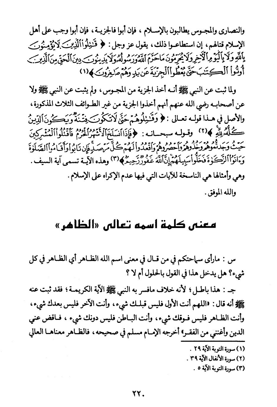 والنصارى والمجوس يطالبون بالإسلام، فإن أبوا فالجزية، فإن أبوا وجب على أهل الإسلام قتالهم، إن استطاعوا ذلك، يقول عز وجل: {قَاتِلُوا الَّذِينَ لَا يُؤْمِنُونَ بِاللَّهِ وَلَا بِالْيَوْمِ الْآخِرِ وَلَا يُحَرِّمُونَ مَا حَرَّمَ اللَّهُ وَرَسُولُهُ وَلَا يَدِينُونَ دِينَ الْحَقِّ مِنَ الَّذِينَ أُوتُوا الْكِتَابَ حَتَّى يُعْطُوا الْجِزْيَةَ عَنْ يَدٍ وَهُمْ صَاغِرُونَ} (¬1)