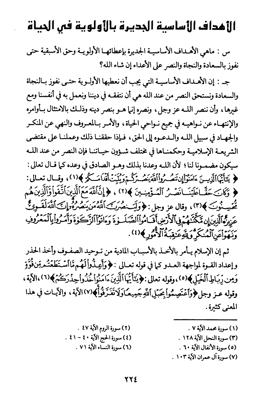 جـ: إن الأهداف الأساسية التي يجب أن نعطيها الأولوية حتى نفوز بالنجاة والسعادة ونستحق النصر من عند الله هي أن نتفقه في ديننا ونعمل به في أنفسنا ومع غيرها، وأن ننصر الله عز وجل، ونصره إنما هو بنصر دينه وذلك بالامتثال بأوامره والانتهاء عن نواهيه في جميع نواحي الحياة، والأمر بالمعروف والنهي عن المنكر والجهاد في سبيل الله والدعوة إلى الحق، فإذا حققنا ذلك وعملنا على مقتضى الشريعة الإسلامية وحكمناها في مختلف شئون حياتنا فإن النصر من عند الله سيكون مضمونا لنا؛ لأن الله وعدنا بذلك وهو الصادق في وعده كما قال تعالى: {يَا أَيُّهَا الَّذِينَ آمَنُوا إِنْ تَنْصُرُوا اللَّهَ يَنْصُرْكُمْ وَيُثَبِّتْ أَقْدَامَكُمْ} (¬1) وقال تعالى: {وَكَانَ حَقًّا عَلَيْنَا نَصْرُ الْمُؤْمِنِينَ} (¬2) ، {إِنَّ اللَّهَ مَعَ الَّذِينَ اتَّقَوْا وَالَّذِينَ هُمْ مُحْسِنُونَ} (¬3) وقال عز وجل: {وَلَيَنْصُرَنَّ اللَّهُ مَنْ يَنْصُرُهُ إِنَّ اللَّهَ لَقَوِيٌّ عَزِيزٌ} (¬4) {الَّذِينَ إِنْ مَكَّنَّاهُمْ فِي الْأَرْضِ أَقَامُوا الصَّلَاةَ وَآتَوُا الزَّكَاةَ وَأَمَرُوا بِالْمَعْرُوفِ وَنَهَوْا عَنِ الْمُنْكَرِ وَلِلَّهِ عَاقِبَةُ الْأُمُورِ} (¬5)
