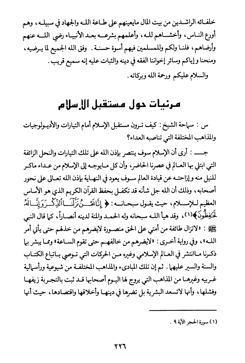 جـ: أرى أن الإسلام سوف ينتصر بإذن الله على تلك التيارات والنحل الزائفة التي ابتلي بها العالم في عصرنا الحاضر، وأن كل ما يوجه إلى الإسلام من عداء ماكر للنيل منه وإزاحته عن قيادة العالم سوف يعود في النهاية بإذن الله تعالى على نحور أصحابه، وذلك أن الله جل شأنه قد تكفل بحفظ القرآن الكريم الذي هو الأساس العظيم للإسلام، حيث يقول سبحانه: {إِنَّا نَحْنُ نَزَّلْنَا الذِّكْرَ وَإِنَّا لَهُ لَحَافِظُونَ} (¬1)