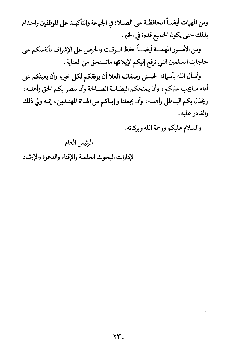 وأسأل الله بأسمائه الحسنى وصفاته العلى أن يوفقكم لكل خير، وأن يعينكم على أداء ما يجب عليكم، وأن يمنحكم البطانة الصالحة وأن ينصر بكم الحق وأهله، ويخذل بكم الباطل وأهله، وأن يجعلنا وإياكم من الهداة المهتدين، إنه ولي ذلك والقادر عليه. والسلام عليكم ورحمة الله وبركاته.