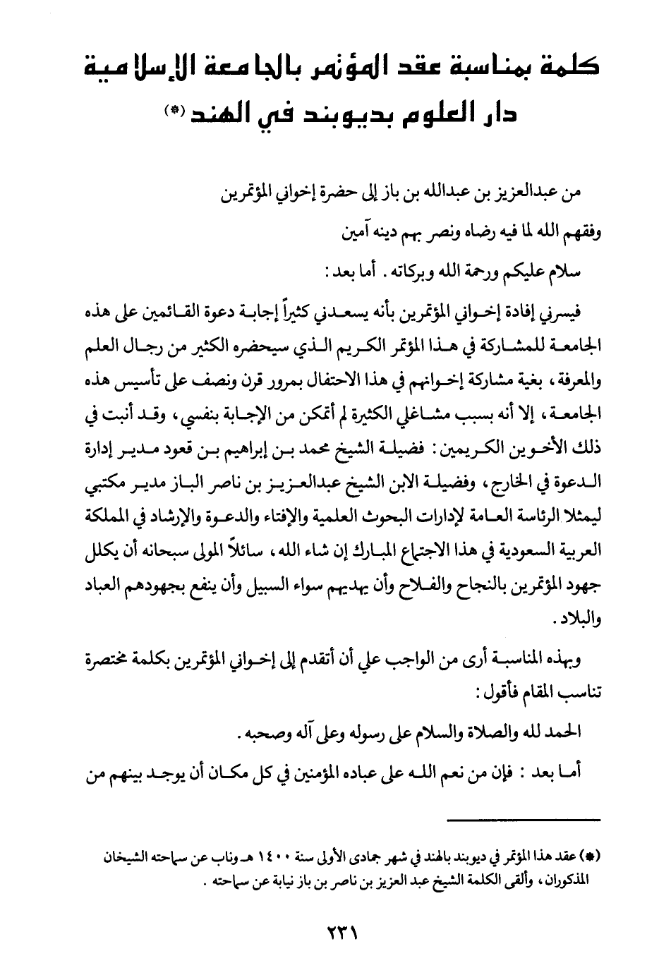 أما بعد: فيسرني إفادة إخواني المؤتمرين بأنه يسعدني كثيرا إجابة دعوة القائمين على هذه الجامعة للمشاركة في هذا المؤتمر الكريم الذي سيحضره الكثير من رجال العلم والمعرفة، بغية مشاركة إخوانهم في هذا الاحتفال بمرور قرن ونصف على تأسيس هذه الجامعة، إلا أنه بسبب مشاغلي الكثيرة لم أتمكن من الإجابة بنفسي، وقد أنبت في ذلك الأخوين الكريمين: فضيلة الشيخ محمد بن إبراهيم بن قعود مدير إدارة الدعوة في الخارج، وفضيلة الابن الشيخ عبد العزيز بن ناصر الباز مدير مكتبي ليمثلا الرئاسة العامة لإدارات البحوث العلمية والإفتاء والدعوة والإرشاد في المملكة العربية السعودية في هذا الاجتماع المبارك إن شاء الله، سائلا المولى سبحانه أن يكلل جهود المؤتمرين بالنجاح والفلاح وأن يهديهم سواء السبيل، وأن ينفع بجهودهم العباد والبلاد.